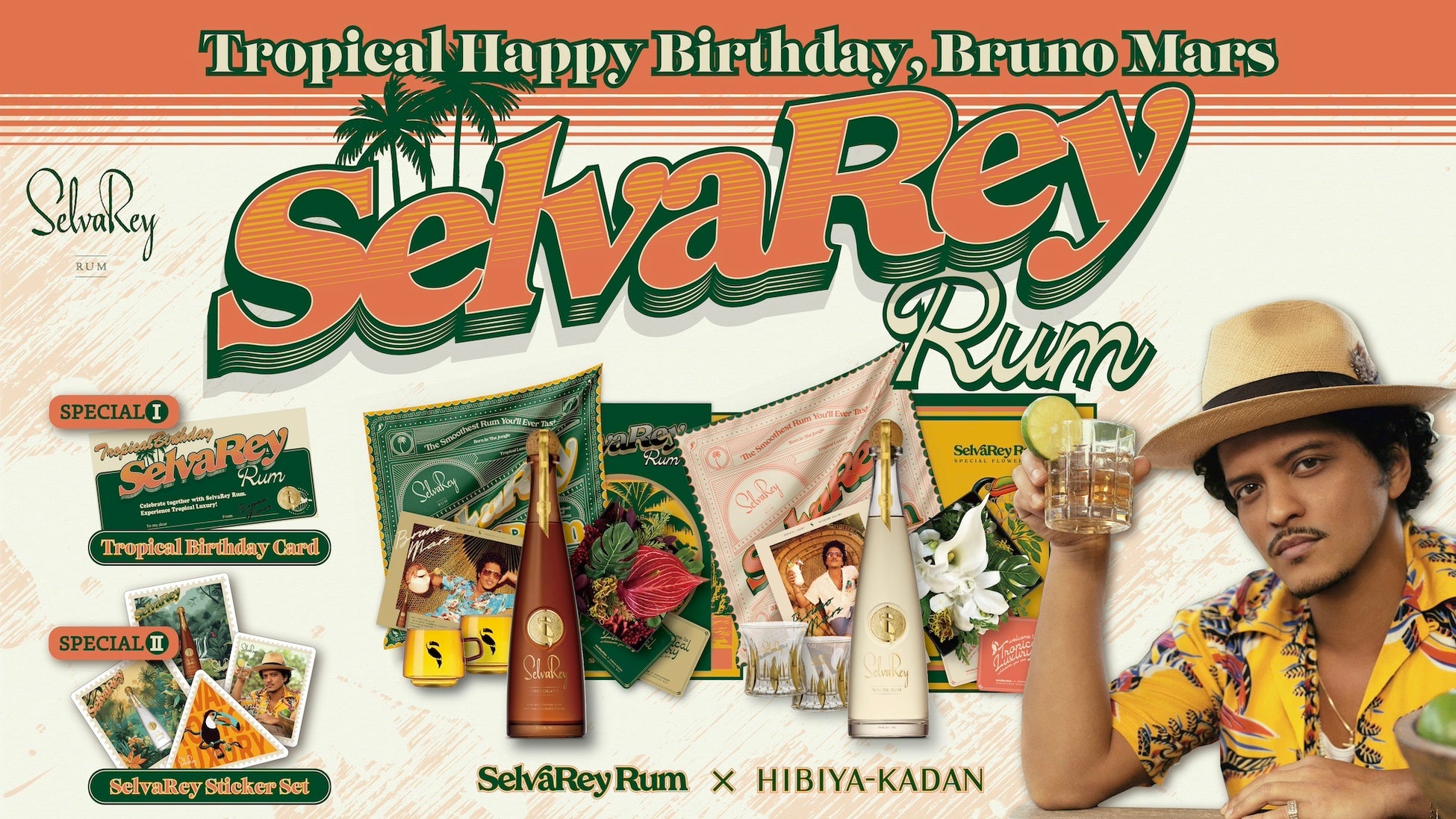 Bruno Mars(ブルーノ・マーズ)がオーナーのラムブランド「SelvaRey(セルバレイ)」スペシャルフラワーギフト:好評のうちに完売となった本ギフトが、Bruno Marsの誕生日を記念したTropical Birthdayセットとなって追加限定販売されます。販売開始は、Bruno Marsの誕生日である10月8日。Tropical Birthdayセットには、新たにTropical Birthdayカード1枚とSelvaReyステッカーセット(計4枚:4種類各1枚)が付属します。