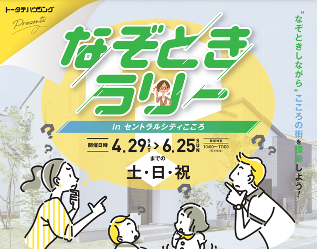 株式会社トータテハウジング(広島県広島市中区 代表取締役社長 山下秀雄)は、4月29日(土)~6月25日(日)(土・日・祝のみ)の期間中、「西風新都セントラルシティこころ」にて、親子で楽しめるイベント『なぞときラリー』を開催致します。