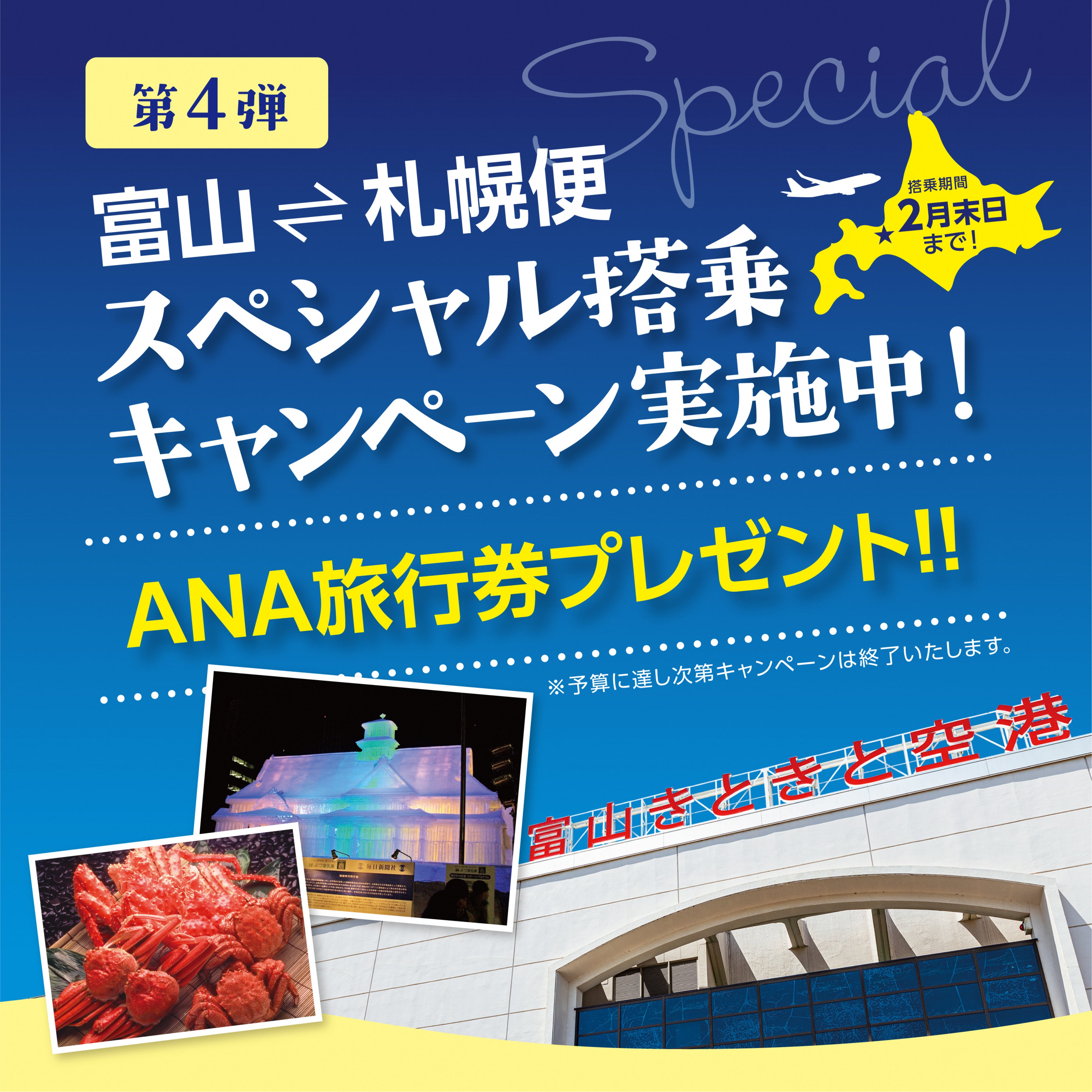 内 容:期間中、富山-札幌便を往復利用または片道2回ご利用された応募者にもれなくANA旅行券(3,000円)をプレゼント※予算に達し次第キャンペーンは終了いたします。