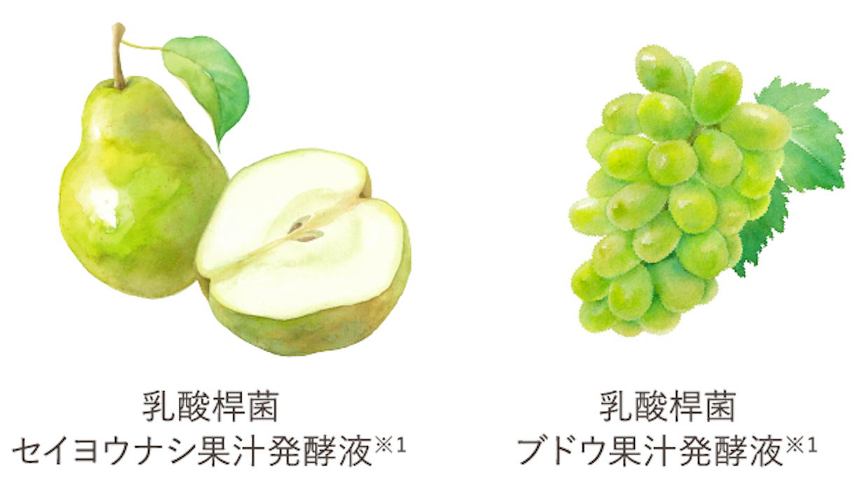 2種の植物由来発酵エキス(乳酸桿菌/ブドウ果汁発酵液(皮膚コンディショニング成分)、乳酸桿菌/セイヨウナシ果汁発酵液(整肌成分) で、乱れて硬くなった古い角質をコットンで拭き取ることで柔らかくほぐしながら取り除き、肌のキメを整え、なめらかな質感にサポートします。