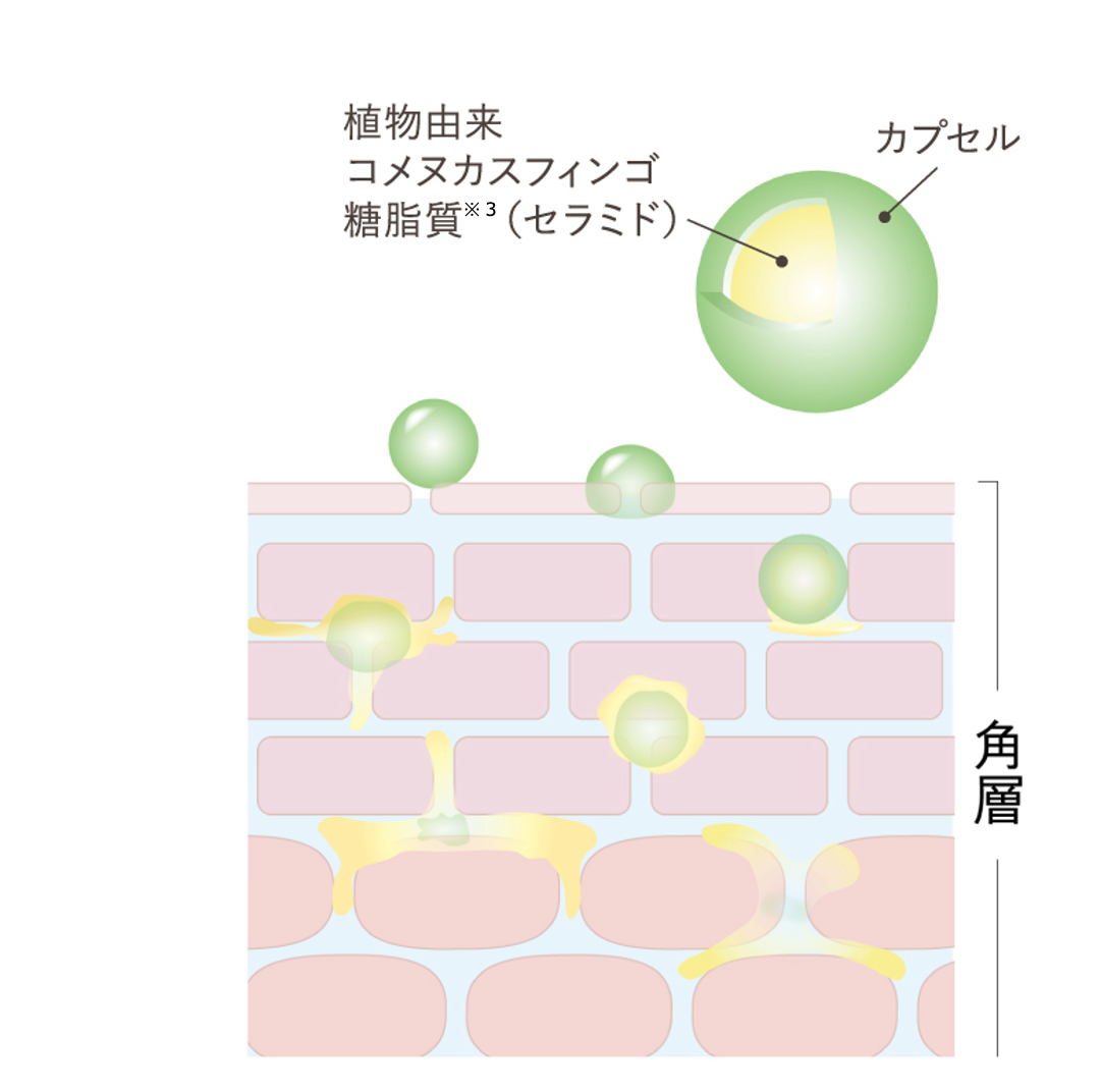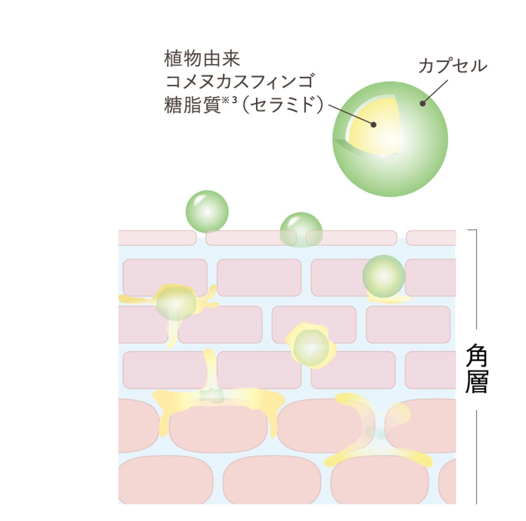 botanicai meeは、セラミドの一種である植物由来「コメヌカスフィンゴ糖脂質※3」を内包したカプセルのデリバリーシステムで、角層のすみずみまで時間をかけて染み出し、じっくり届けうるおいを長時間キープします。