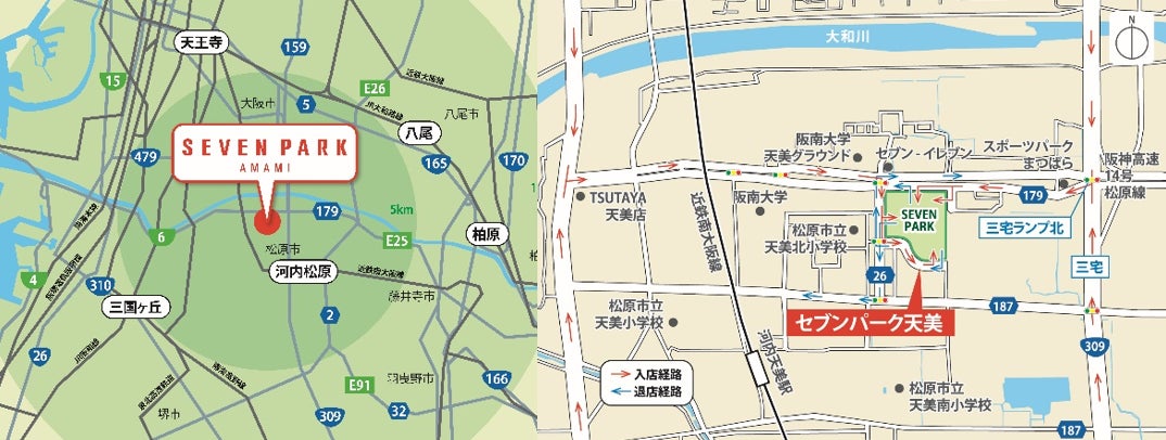 セブンパーク天美が位置する「松原天美」は、国道309号、阪神高速「大和川線・松原線」が交わるクロスポイントに位置し、広域からのアクセスに優れております。