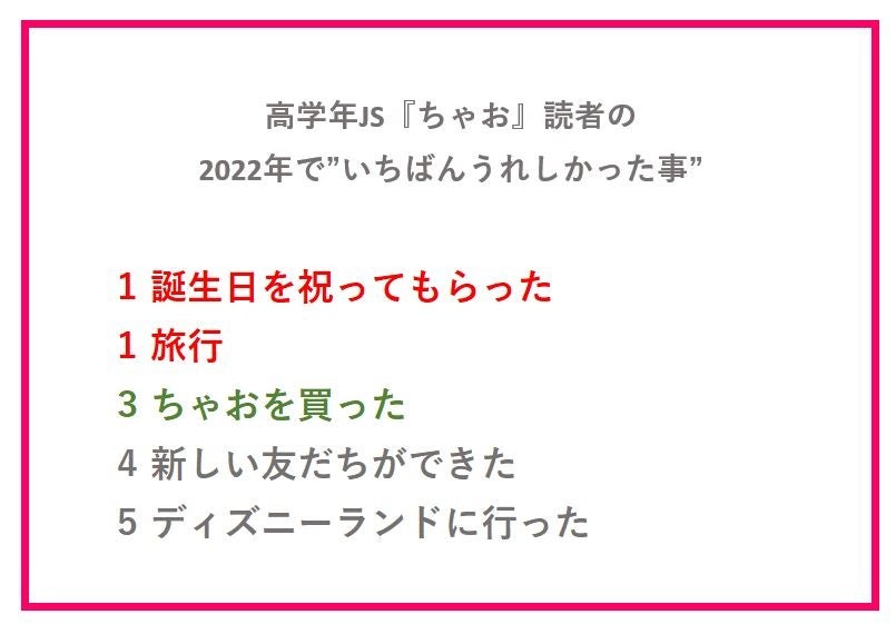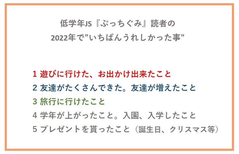 小学館『ぷっちぐみ』と『ちゃお』による「JS研究所」新春トレンド調査。女子小学生(JS)が2022年で、いちばんうれしかった事は “旅行”や“お出かけ出来たこと”