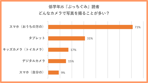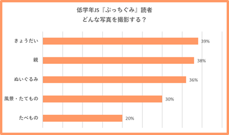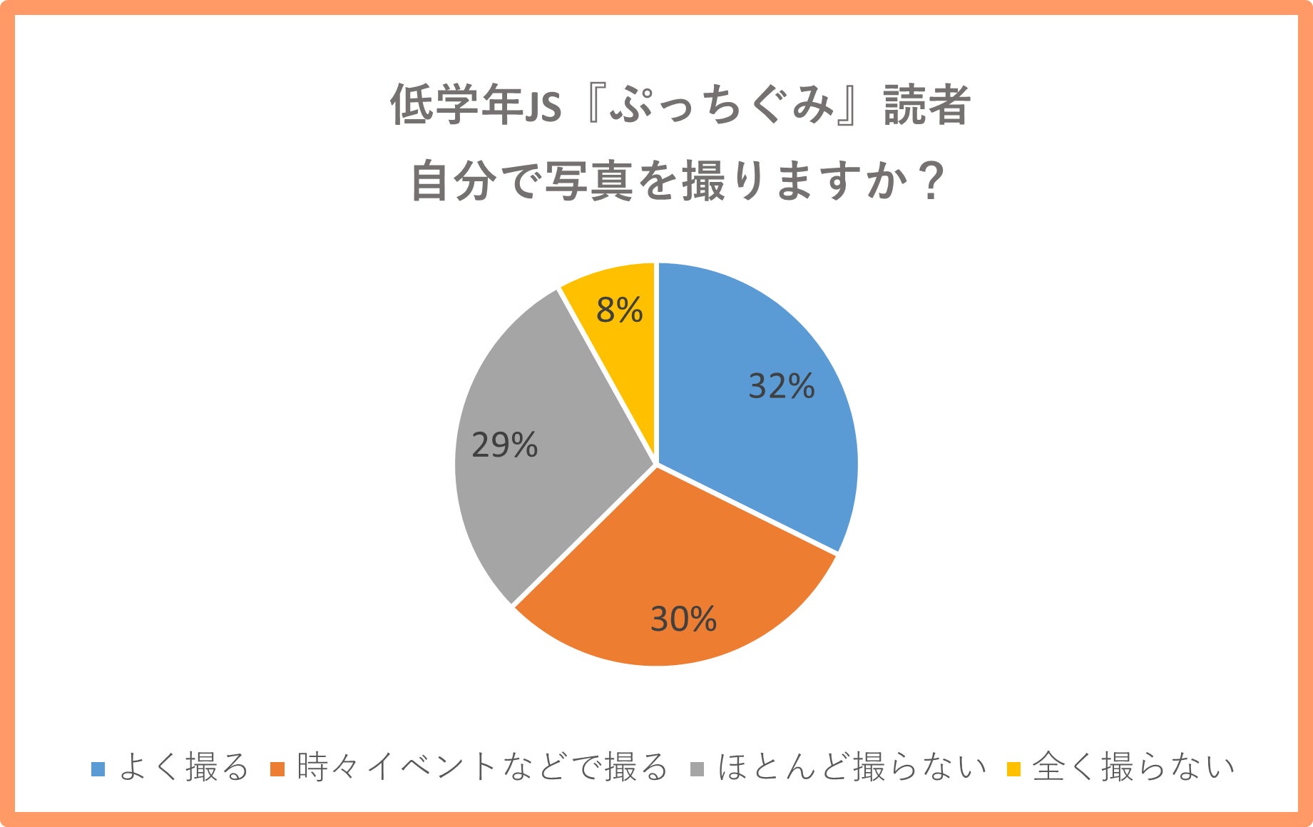 低学年JS『ぷっちぐみ』読者も「時々イベントなどで撮る」を含め、6割以上が自身で写真を撮影していると回答。「よく撮る」という子は約3割という結果となっており、積極的にカメラや写真にふれている子もいるようです。