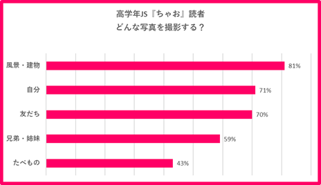 行動制限が解除されたことにより、皆がだいぶ外に出たり、友人達と交流することが出来ているのと、それを「待ってました!」と楽しみ、喜んでいるのを感じます。そして今回のデータでも高学年の子達は「恋愛」に興味津々ということが見てとれます。またカメラ事情では高学年では「チェキ」を使うようになってくるのが特徴的。「チェキ」は『ちゃお』の懸賞でも人気が高く、友達と集まって撮影会をしているようです!友活に使える、その場で交換できるなど大人気です。(『ちゃお』編集長)