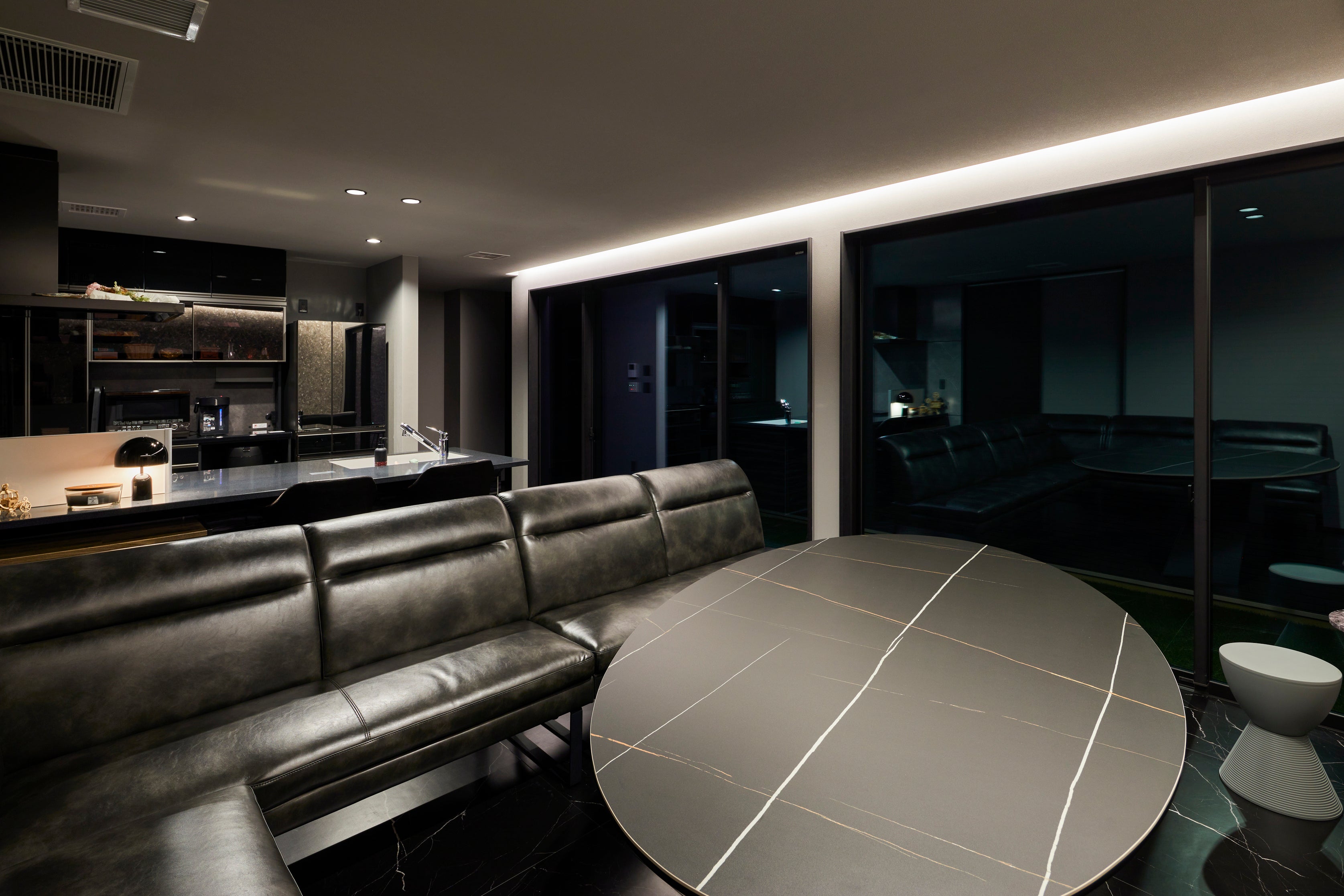 中庭に面したLDKの大開口片引き窓はカーテンレスにすることで、より広さを感じられる設計に。また、窓側からテレビ背面までL字に入った間接照明でバーのような雰囲気に仕上げています。