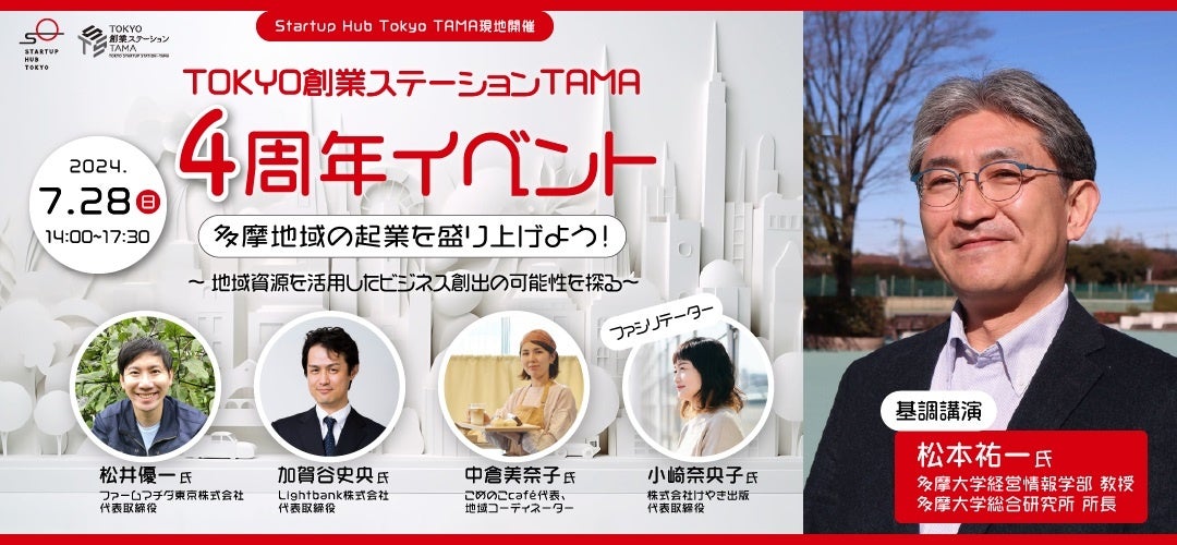 4周年イベントでは、「多摩地域の起業を盛り上げよう!」をテーマに、多摩大学 経営情報学部の松本教授による基調講演と、多摩の起業家4名をお招きしたパネルディスカッションを実施します。