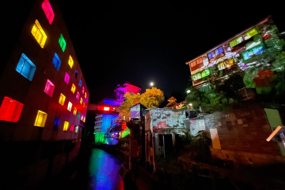 日暮れ後は、大湯温泉の宿泊施設をライトアップし、外壁にプロジェクションマッピングを投影。あでやかな雰囲気の中でもライブパフォーマンスが開催され、イベントは大盛況のうちに終えることができました。
