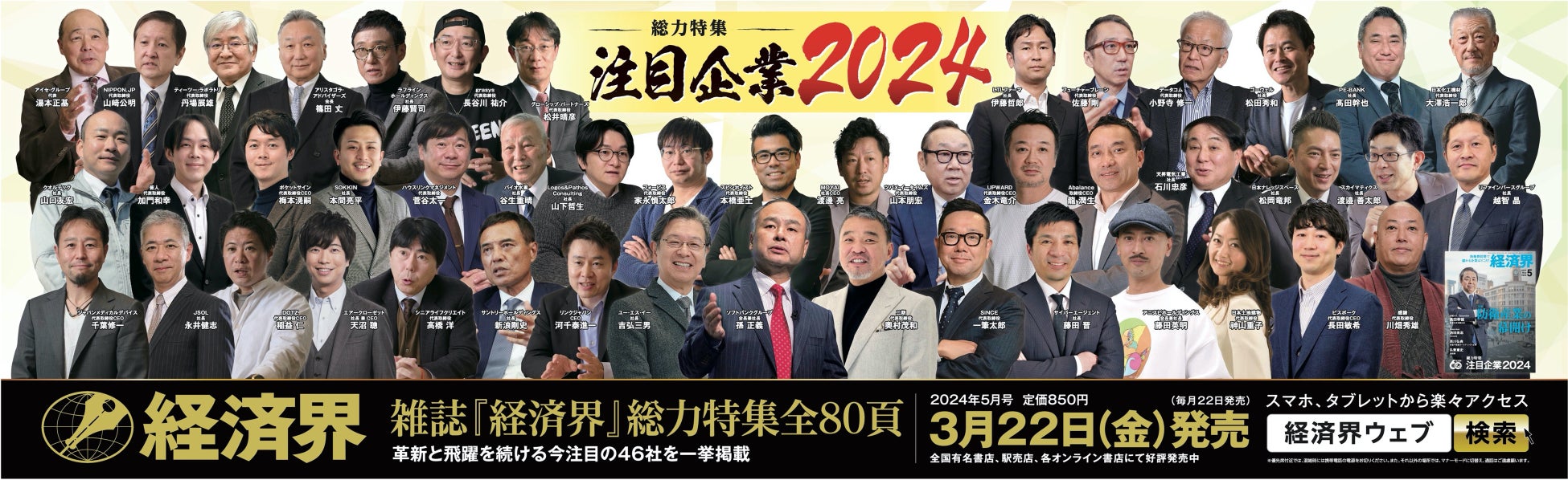 概要:激動の1年の到来だ。日本国内では歴史的円安が猛威を振るい、日経平均がバブル崩壊後最高値を更新するニュースが話 題となる一方で、日銀も長短金利操作の撤廃とマイナス金利 解除が現実味を帯びつつあり、市場環境の大きな変化が目前 に迫る。世界市場を冷え込ませる地政学的リスクも見過ごせ ない。本特集では、このような厳しい環境を克服しつつ、ピンチ をチャンスに変え、さらなる事業拡大や新事業創出に向けて取 り組む企業を取り上げる。激動のタイミングこそ、企業が蓄えていた実力を縦横に発揮するチャンスとなる。(https://net.keizaikai.co.jp/2024_chumoku-kigyo より)