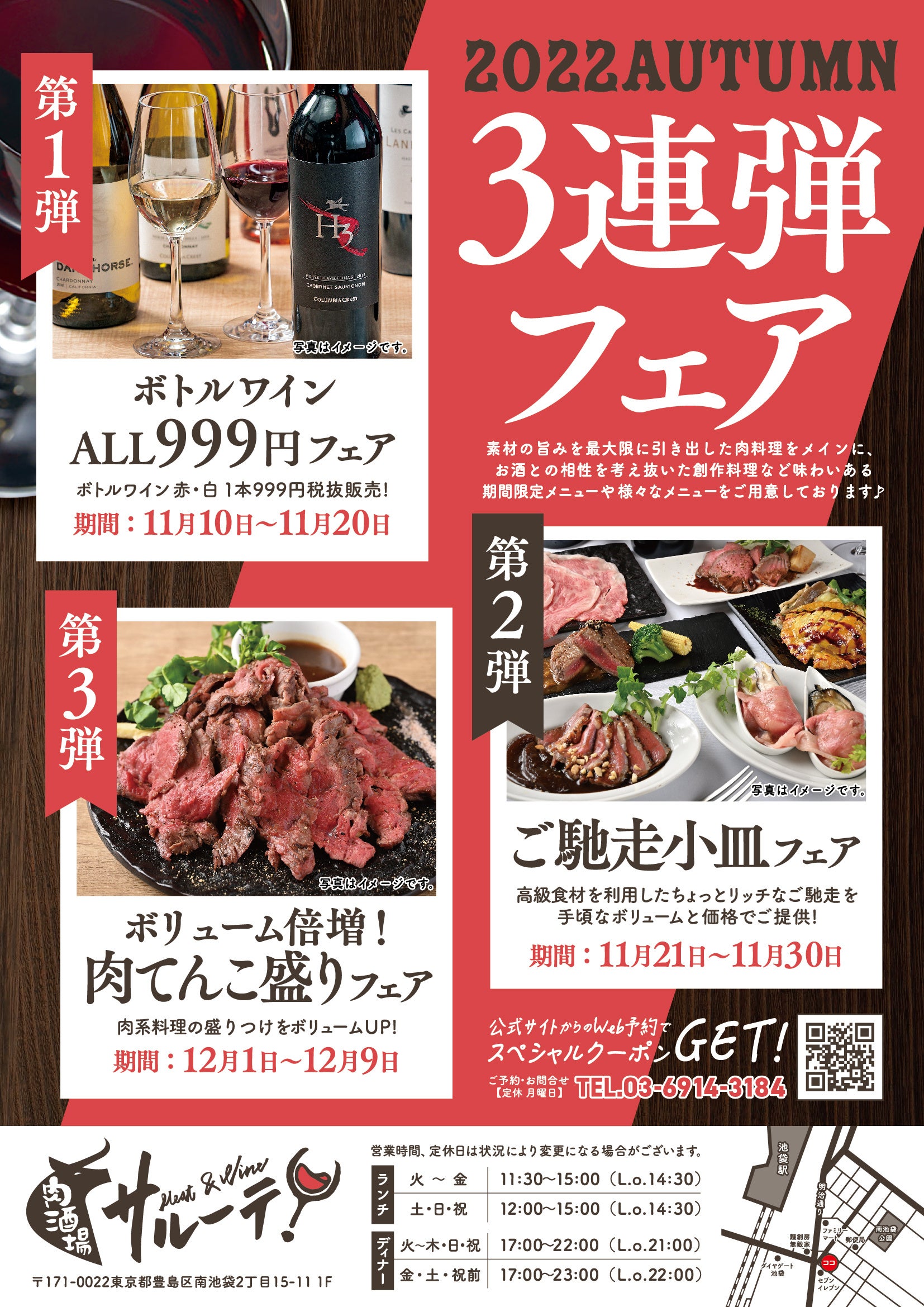 ボトルワイン999円!お肉てんこ盛り!11月10日(木)~12月9日(金)「Meat&Wine肉酒場サルーテ池袋店」秋冬のお得な3連弾フェア開催!