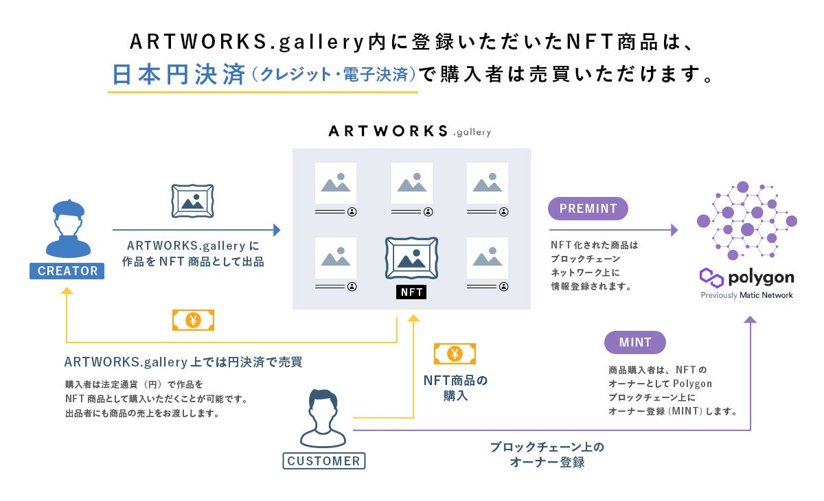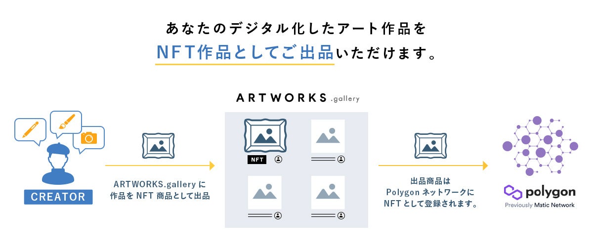 ARTWORKS.galleryでは、NFT出品や売買の仲介を行うことで、手軽な円決済での作品のやりとりを可能としており、購入者にとってのハードルも取り除いております。作品の出品者についても円の支払いで作品の売上を受け取ることが可能です。