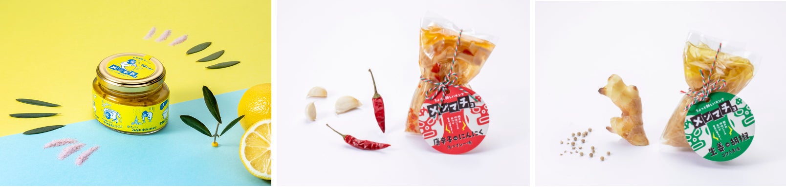 (メンマチョ小売商品ラインナップ。左から:メンマチョ わたしの瀬戸内レモン、メンマチョ唐辛子VSにんにく、メンマチョ生姜VSコショウ)
