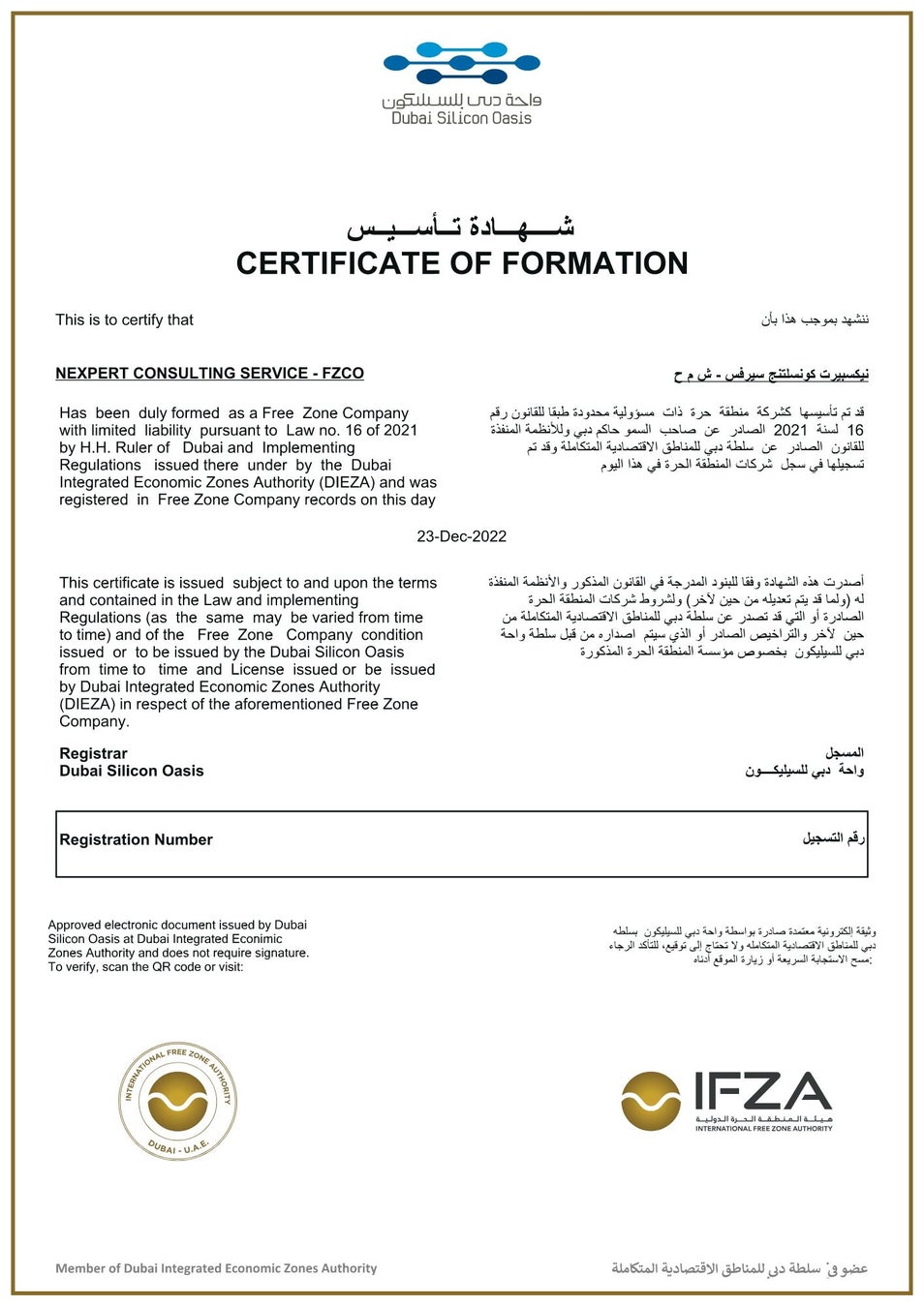 今回のドバイ法人設立にあたり、ネクスパート法律事務所は、ドバイの国際フリーゾーン機関(海外の投資家に税制優遇措置と関税特権を提供するために設立された経済特区)の一つであるIFZAのパートナーに就任しました。