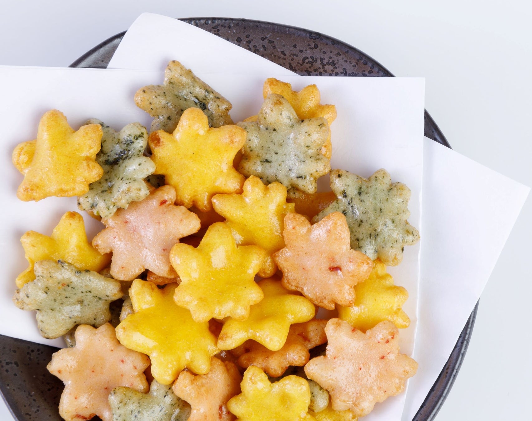 「山もみじ」・・秋の商品を作りたいという想いで型を作り、3色のもみじをミックスしてみたら華やかな印象になりました。3色がそれぞれはっきりと出るように色の薄い醤油を使っています。
