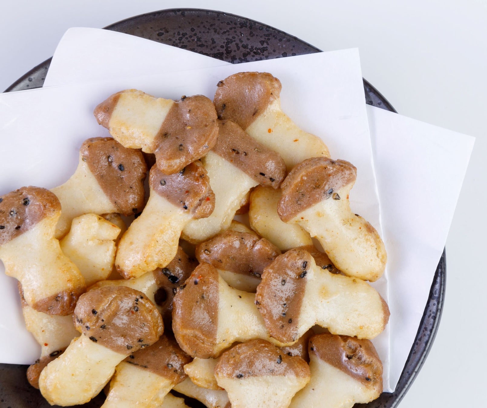背中だけが緑色のふぐ、傘の部分だけが茶色の松茸、上下色が違う栗などツートーンカラーのオリジナルあられ。 単色の餅生地を作る時間の3倍~5倍の手間と時間をかけて作る他社にない弊社だけの製法です。