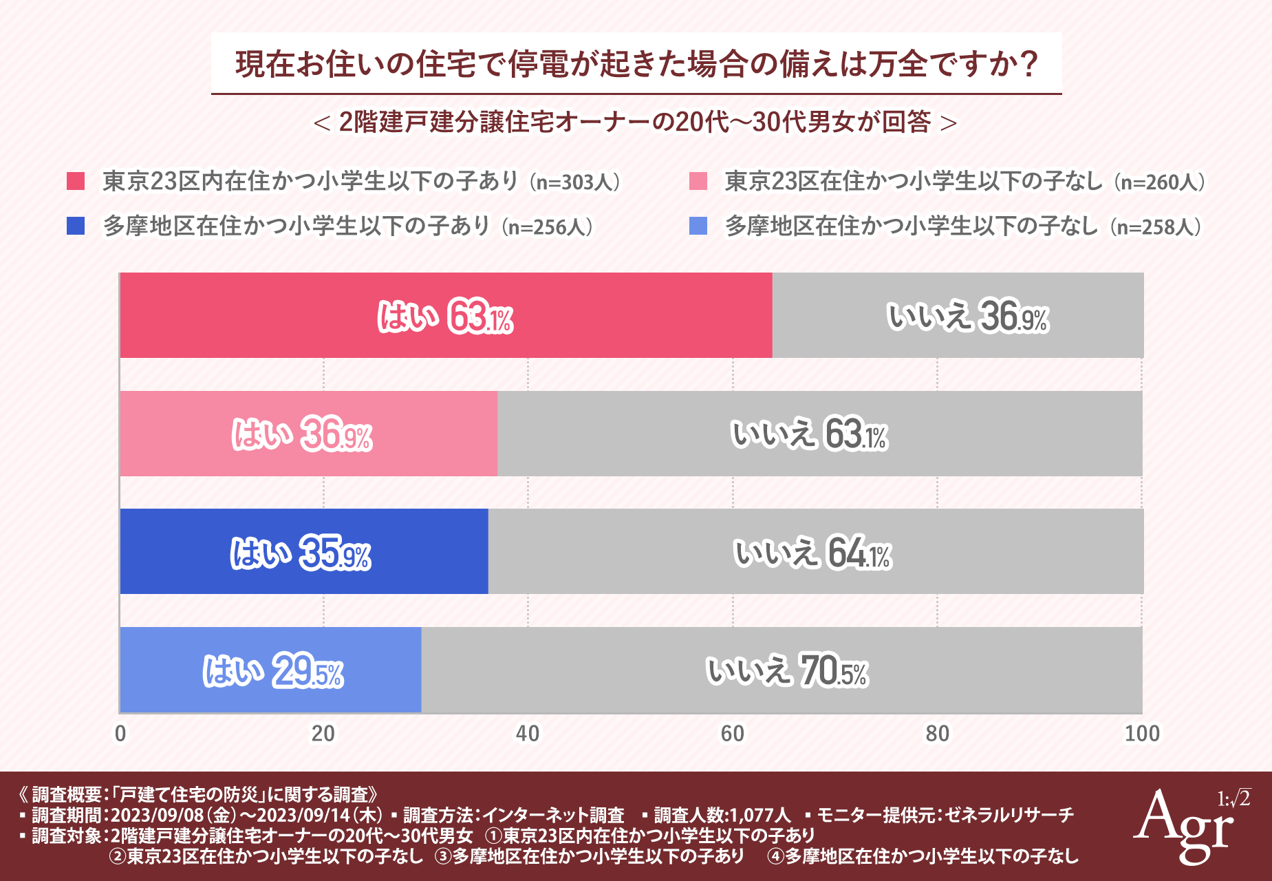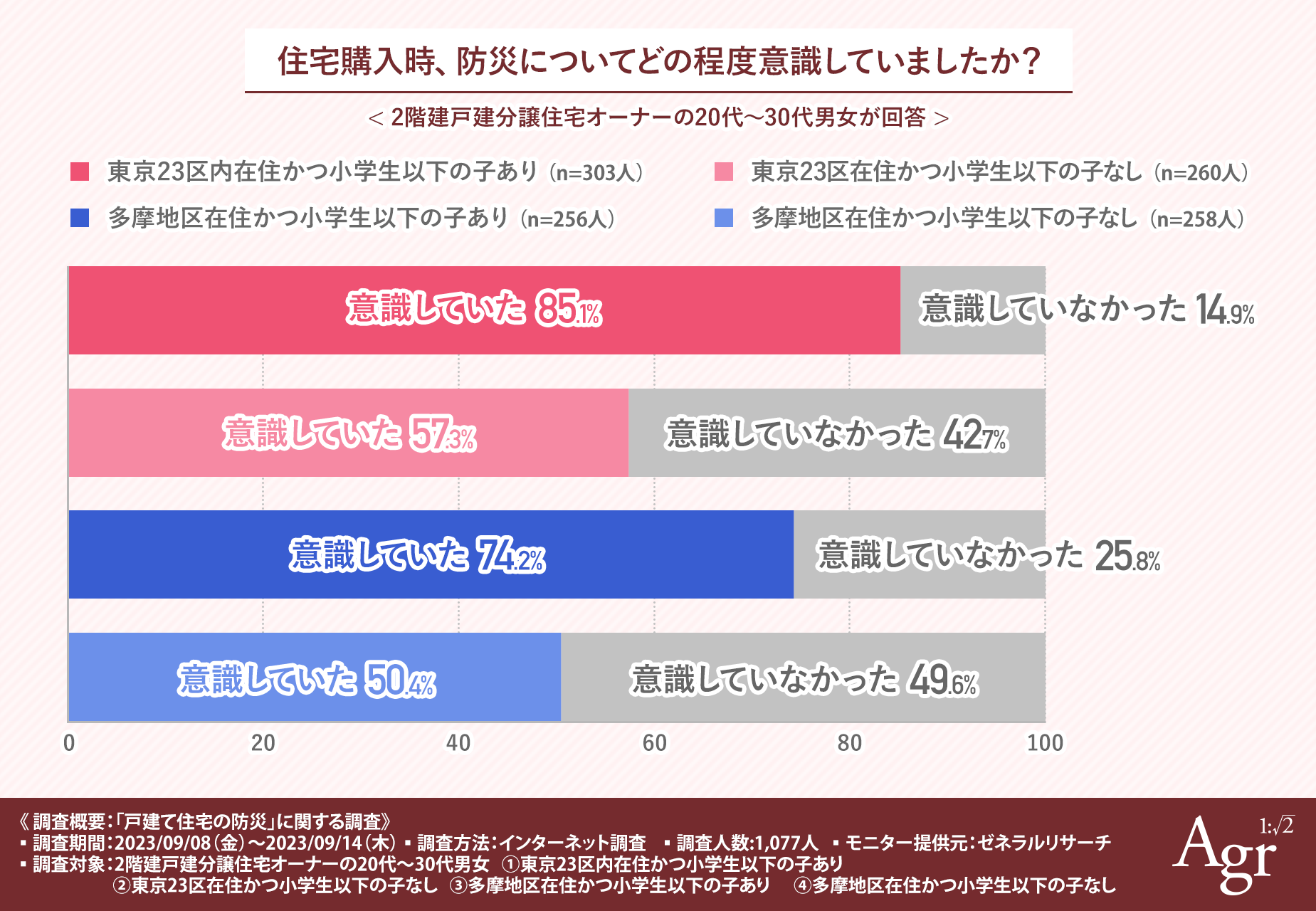 そこで、東京・神奈川を中心に新築戸建て住宅を自社一貫体制で分譲するアグレ都市デザイン株式会社は、2階建戸建分譲住宅オーナーの20代~30代男女を対象に「戸建て住宅の防災」に関する調査を実施しました。