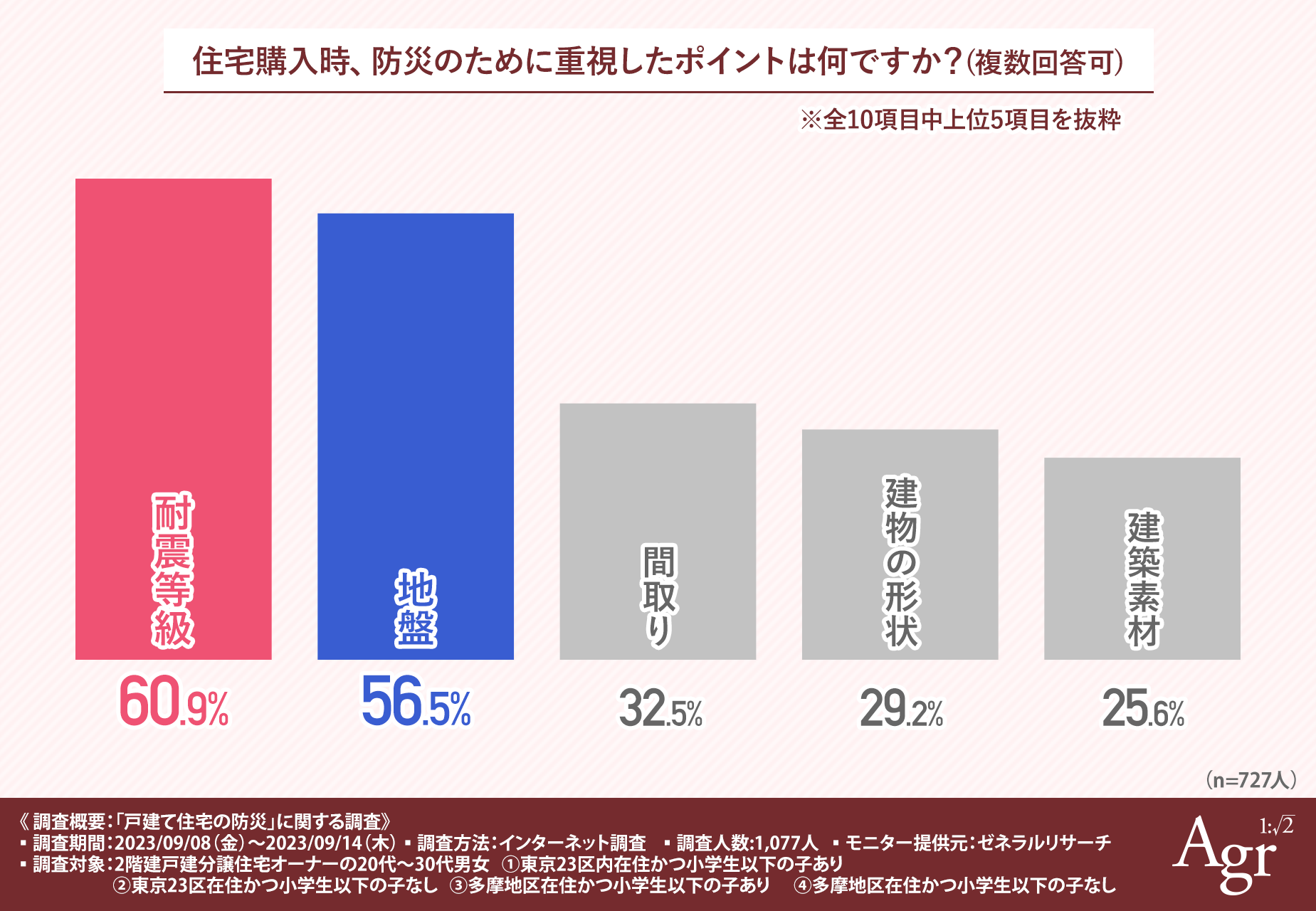 「住宅購入時、防災のために重視したポイントは何ですか?(複数回答可)」と質問したところ、『耐震等級(60.9%)』と回答した方が最も多く、次いで『地盤(56.5%)』『間取り(32.5%)』『建物の形状(29.2%)』『建築素材(25.6%)』と続きました。