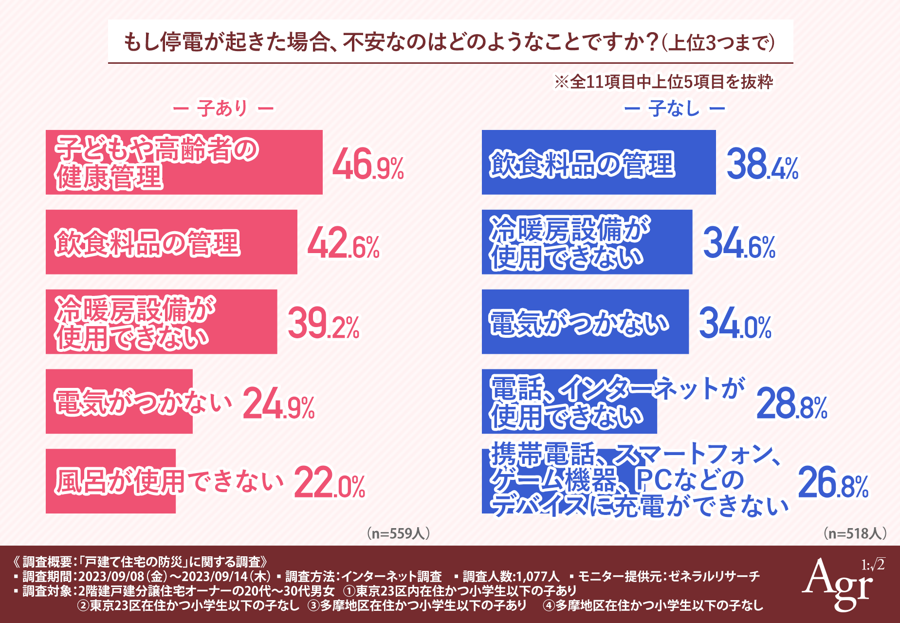子どもがいる家庭では健康管理が最も不安がある一方、子どもがいない家庭では飲食料品の管理や、電話が使えない・充電ができないということに不安を感じる方が多く、子どもの有無で停電に対する不安なポイントに違いがでております。