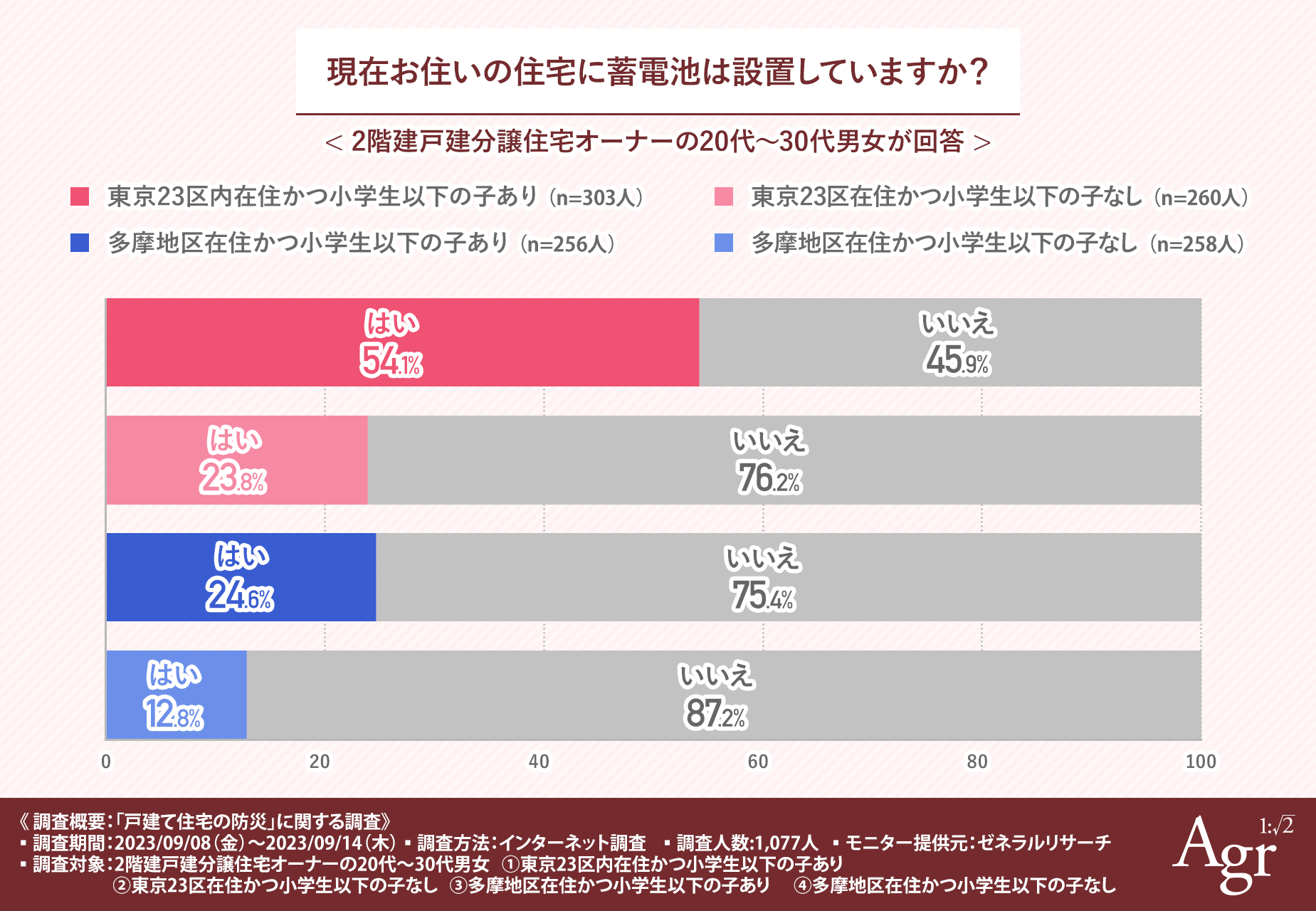 23区内在住の子どもがいる家庭では、半数以上が蓄電池を設置している一方、それ以外は4分の1以下という結果が出ました。