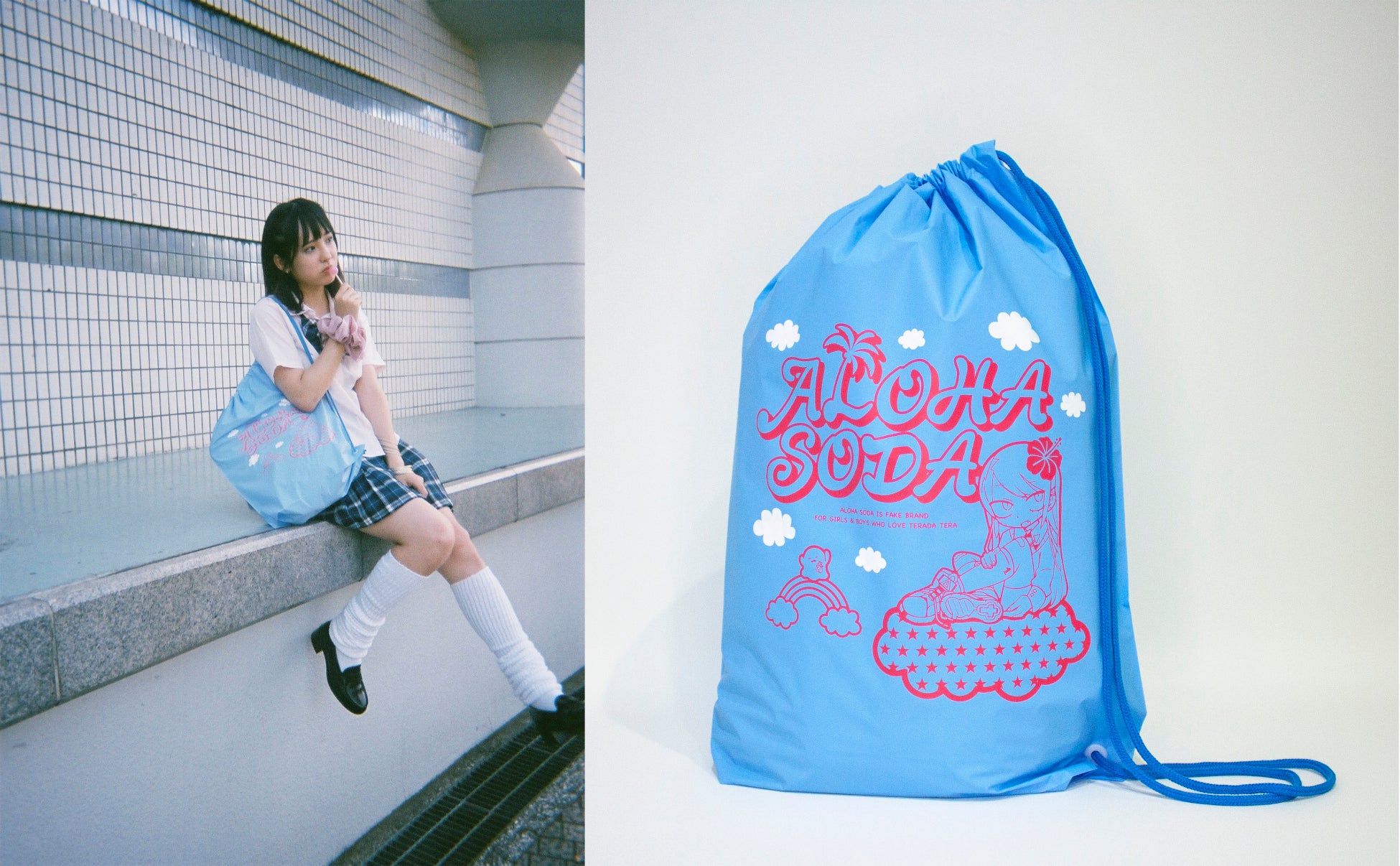 1980年代、1990年代、2000年代のJ-POPと、「FAREWELL, MY L.u.v」の楽曲をミディアム・レゲエアレンジで歌い上げる「FAREWELL, MY D.u.b」。そんなフェアダブと、今回は特別にフェアラブからゆいかも参加し、90年代前後のカルチャーやY2Kファッションをリバイバルする活動の延長線上として、今回のショッパーを身にまとい世界観を体現してもらいました。