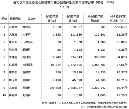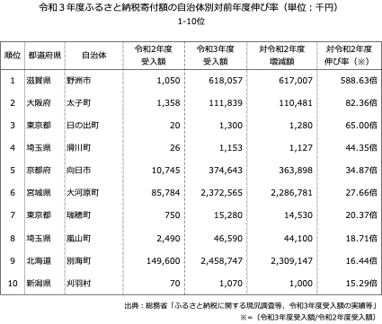 『ふるさと納税分析レポート』令和3年度ふるさと納税寄付額の自治体別対前年度伸び率を分析しました。最も高い自治体は滋賀県野洲市の588.6倍となりました。
