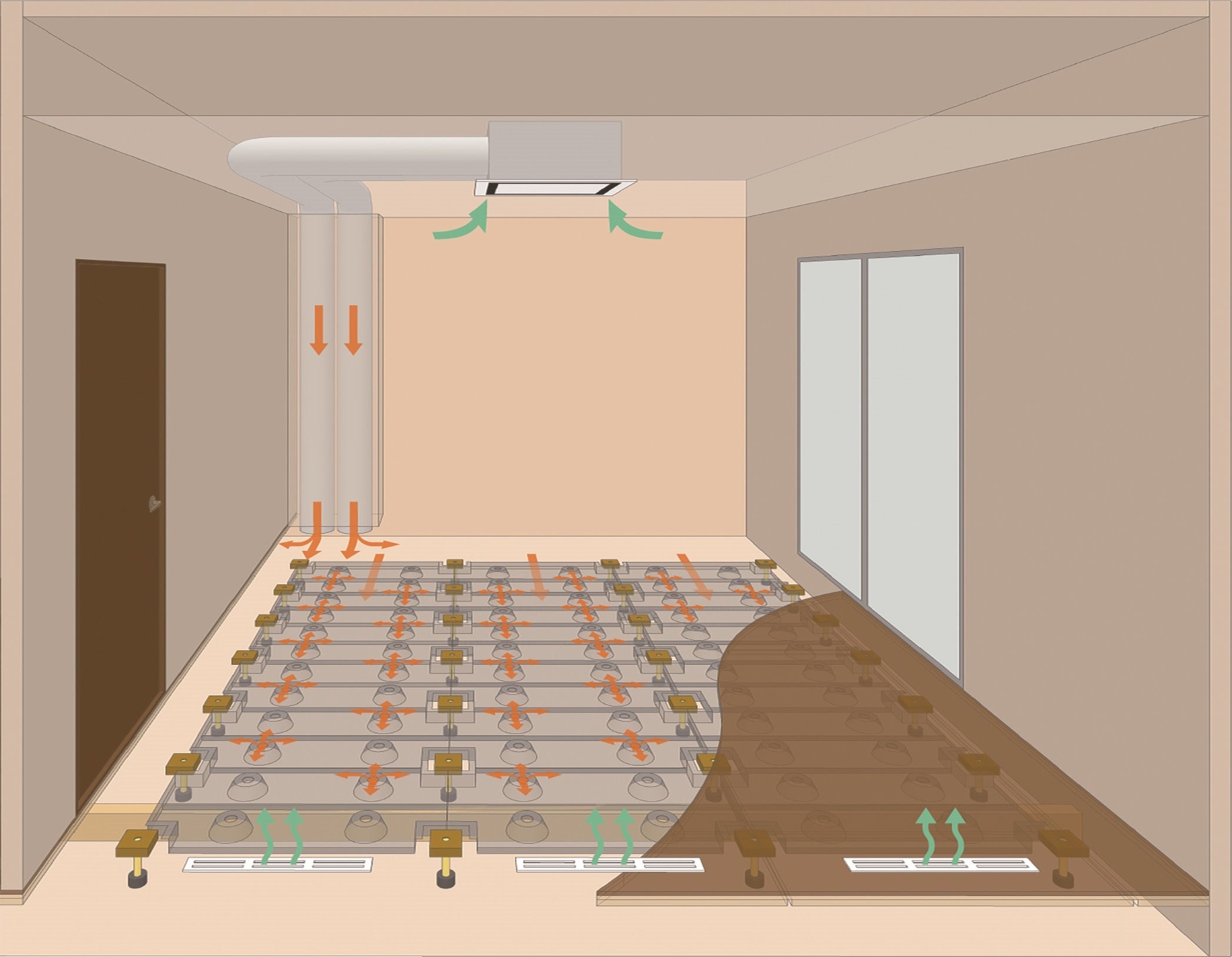 エアコンの風をダクトを通して床下のパネルに送り込み、床からの“ふく射”によって心地よい空間を生み出す、快適性と安全性の両面に配慮した冷暖房システムです。部屋中を均一に冷暖房できるほか、従来の床暖房ほど床表面の温度が上がらないため、低温やけどのリスクも低減。また、気流が直接人に当たらないため、肌の乾燥やホコリの巻き上げも少なく、住宅をはじめ幼保・高齢者施など、お子様や高齢者が過ごす空間でも安心してご利用いただけます。