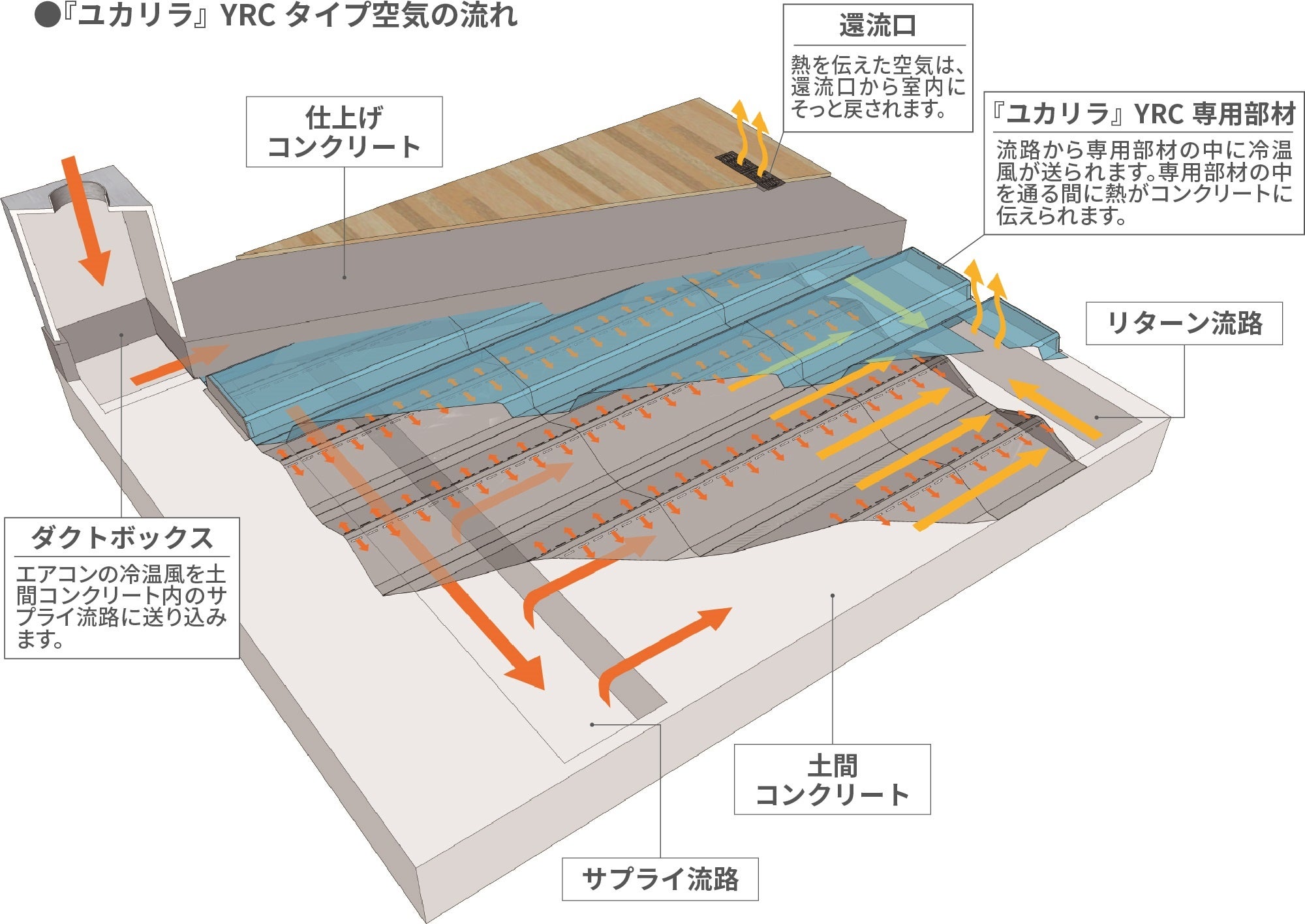 『ユカリラYRCタイプ』は、コンクリート土間仕様の物件に施工できる製品です。既存のYFPタイプでは対応していなかった、倉庫や工場、ホールのような、大規模で床の耐荷重が求められる施設にも施工可能です。もちろん、「ユカリラ」はふく射を利用している空調システムのため、大空間でもムラなく冷暖房できます。