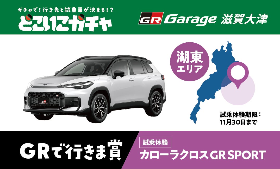 株式会社滋賀トヨタ(本社:滋賀県大津市本宮2丁目9番12号)は、クルマを持つ前に好きになるきっかけをつくる、新しい試乗体験プロモーション「どこいこガチャ」を2025年9月27日(土)よりGR garage 滋賀大津にて開始します。