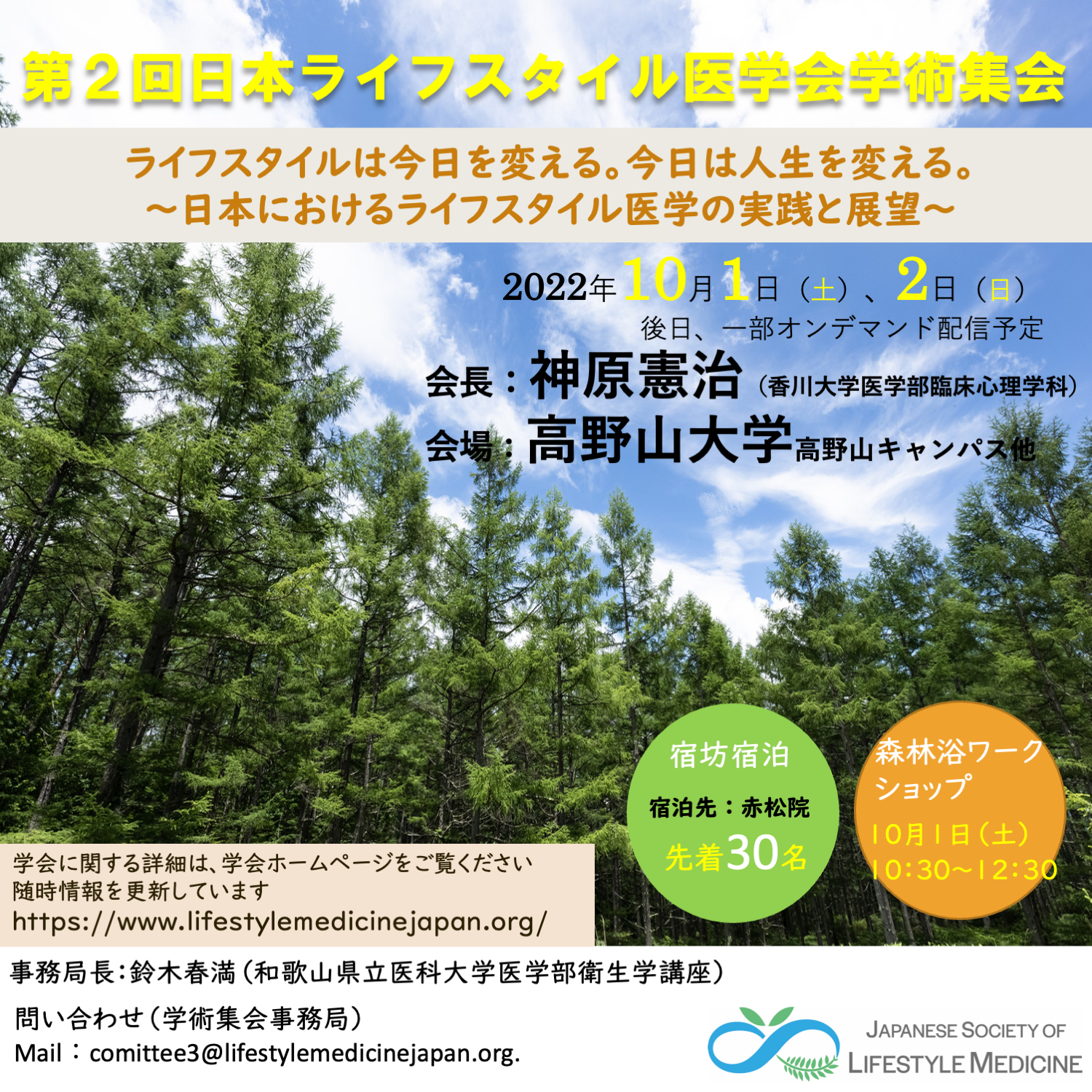 日本ライフスタイル医学会(英名:Japanese Society of Lifestyle Medicine、 通称J S L M)は、2022年10月1日(土)・2日(日)に和歌山県高野山大学にて「第2回日本ライフスタイル医学会学術集会〜日本におけるライフスタイル医学の実践と展望〜」を開催いたします。演者に早稲田大学人間科学学術院・教授 竹中 晃二先生、琉球大学大学院医学研究科 内分泌代謝・血液・膠原病内科学講座(第二内科)教授 益崎 裕章先生を迎え、日本におけるライフスタイル医学の実践と展望について語っていただきます。参加費には会員割引(同時入会可能)や7月31日までの早期割引があります。森林浴体験ができるワークショップも追加で参加可能です。当日は現地参加のみで、後日一部オンデマンド配信を予定しています。