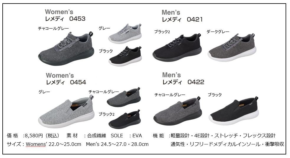 ■レメディの温熱治療タイプは、シューレスタイプとスリッポンタイプにて、それぞれ、レディースとメンズサイズ対応の品番・カラーでの展開となります。
