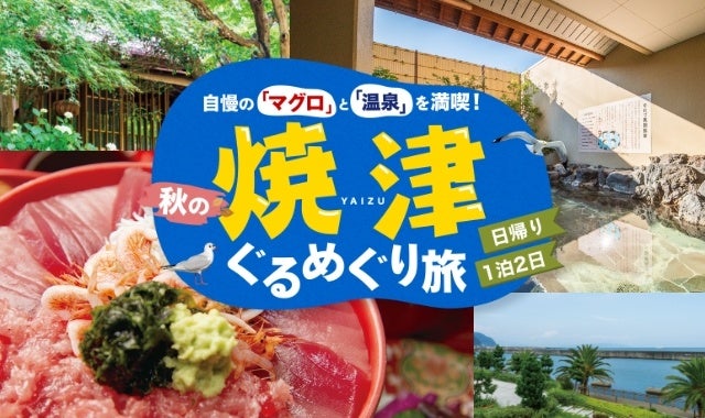 焼津の食を楽しむグルメイベント「焼津ぐるめぐり」の新たな試みとして、焼津ミナミマグロと焼津温泉をセットで楽しめる県外客向けの旅行商品「秋の焼津ぐるめぐり旅」をジェイアール東海ツアーズより販売中です。「さかなのまち焼津」の食と温泉を、旅行を通じて堪能するプランをご提案します。