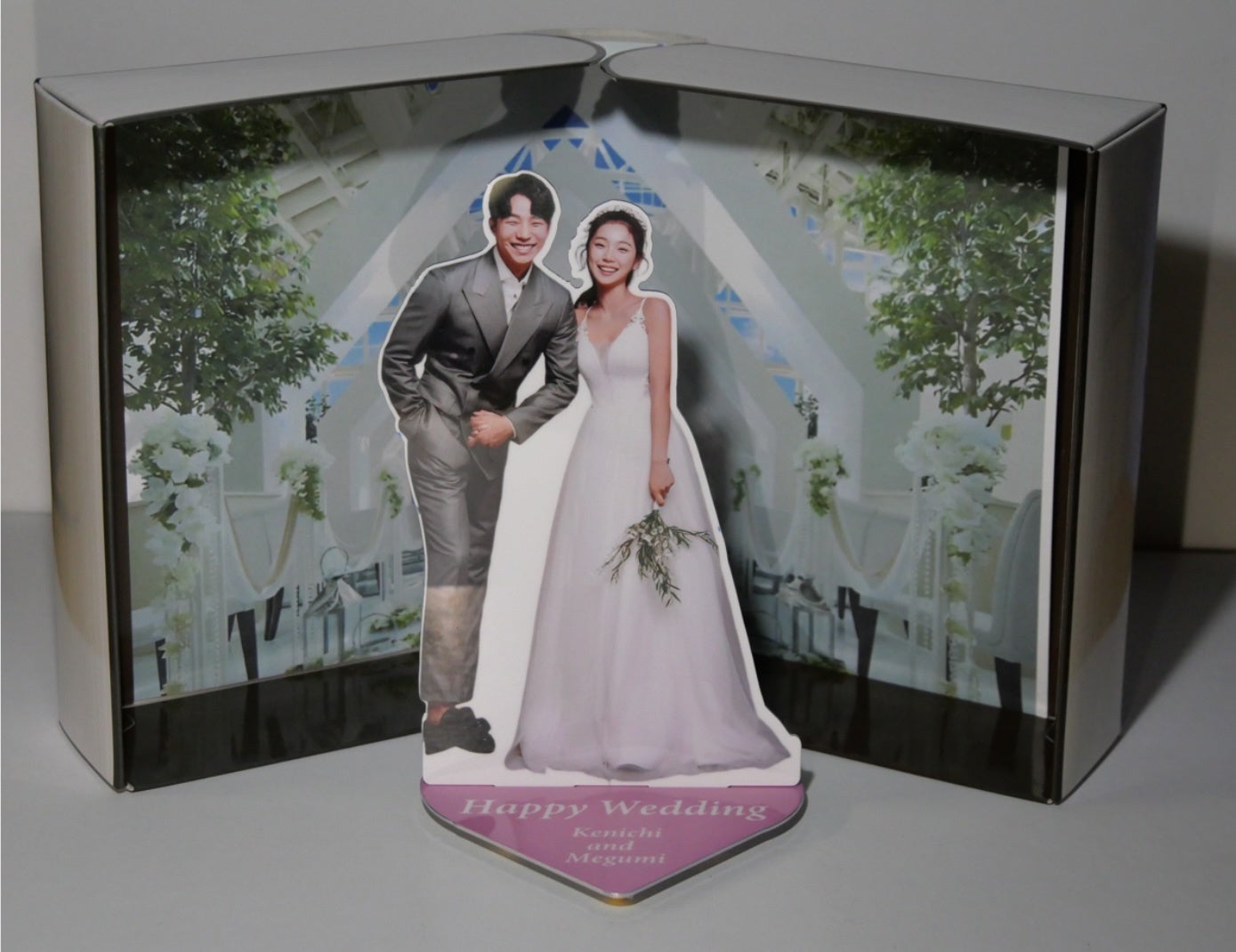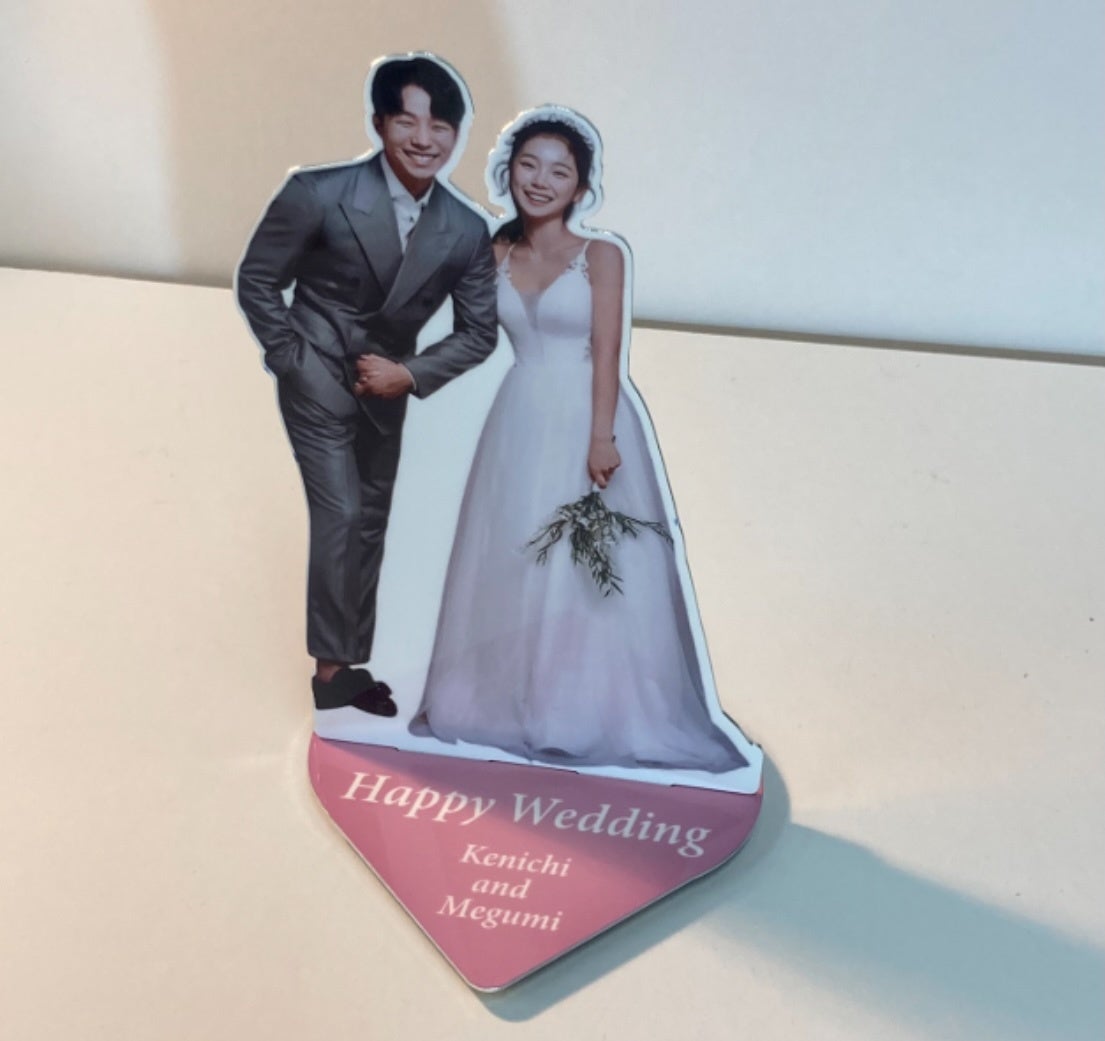 たとえばウェディングフォトを素材にスタンドタイプに加工することが可能です。背景は式場の光景をいれることで、あの日あの時あの場所の思い出を永遠に刻むことができます。人型に合わせて切り出せますので、音楽家のかたやエンターテイメントでアクリルスタンドに続くグッズとすることも可能です。