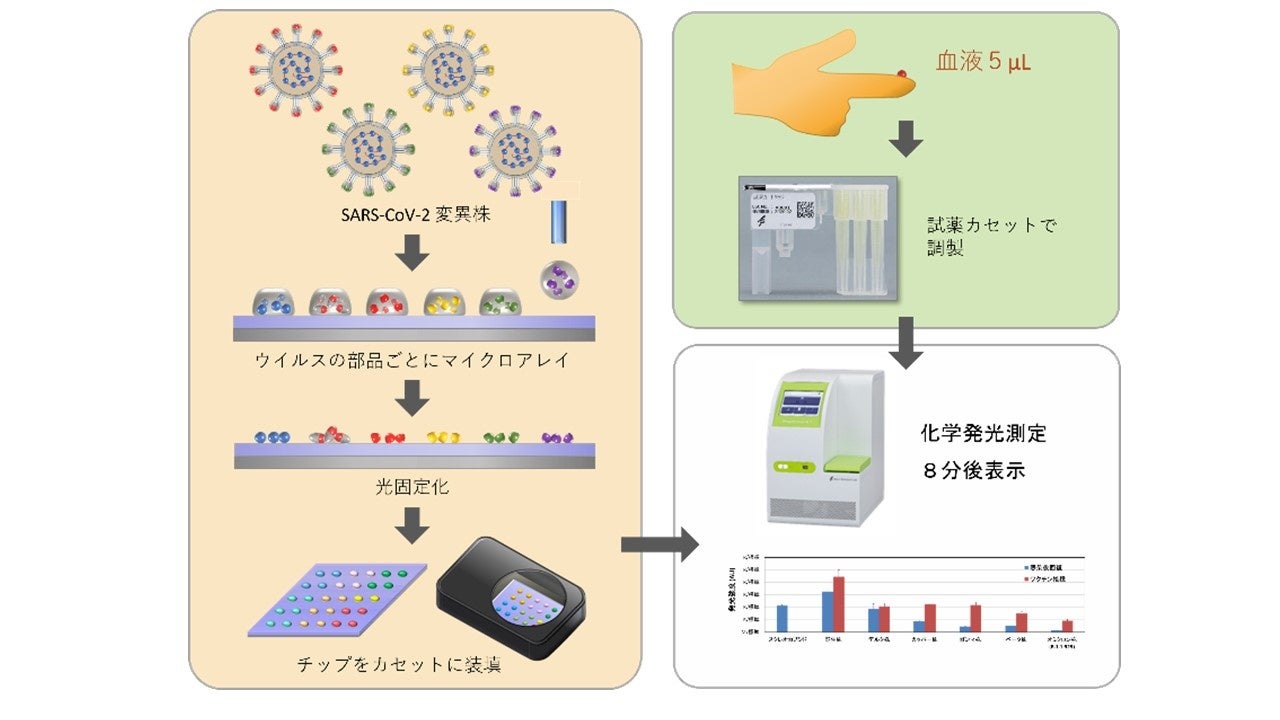 今回、共同研究グループは、SARS-CoV-2を構成するヌクレオカプシド・タンパク質[1]とスパイク・タンパク質[2]、さらに変異株6種のスパイク・タンパク質(デルタ株、オミクロン株由来を含む)を一つのマイクロアレイチップ[3]上に固定化し、それら複数のタンパク質に対する抗体量を完全自動で定量測定できることを示しました。スパイク・タンパク質に結合する抗体の量は、抗体がどれくらいウイルスの体内細胞への感染を防御できるかの目安になります。