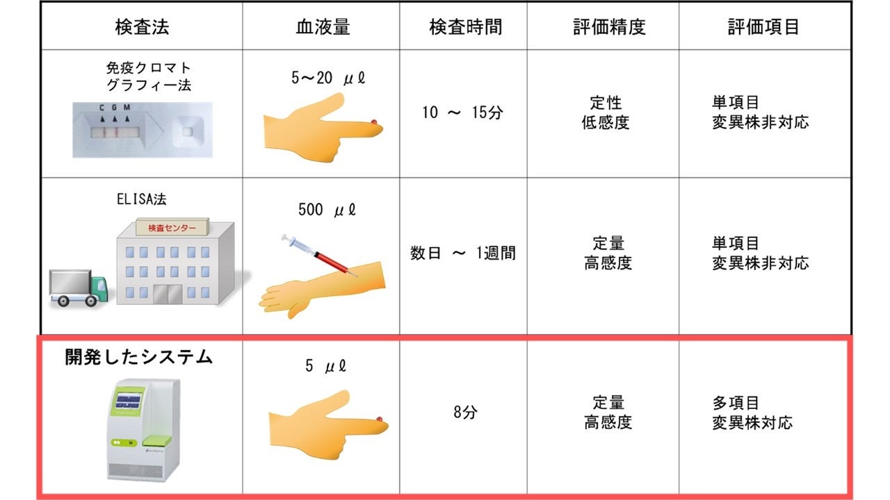現在のウイルス抗体検査には、医療現場における免疫クロマトグラフィー法による簡易検査、もしくは分析センターにおける精密検査がある。今回の開発技術では1滴の血液を用いて変異株に対する抗体量が8分で測定できる。