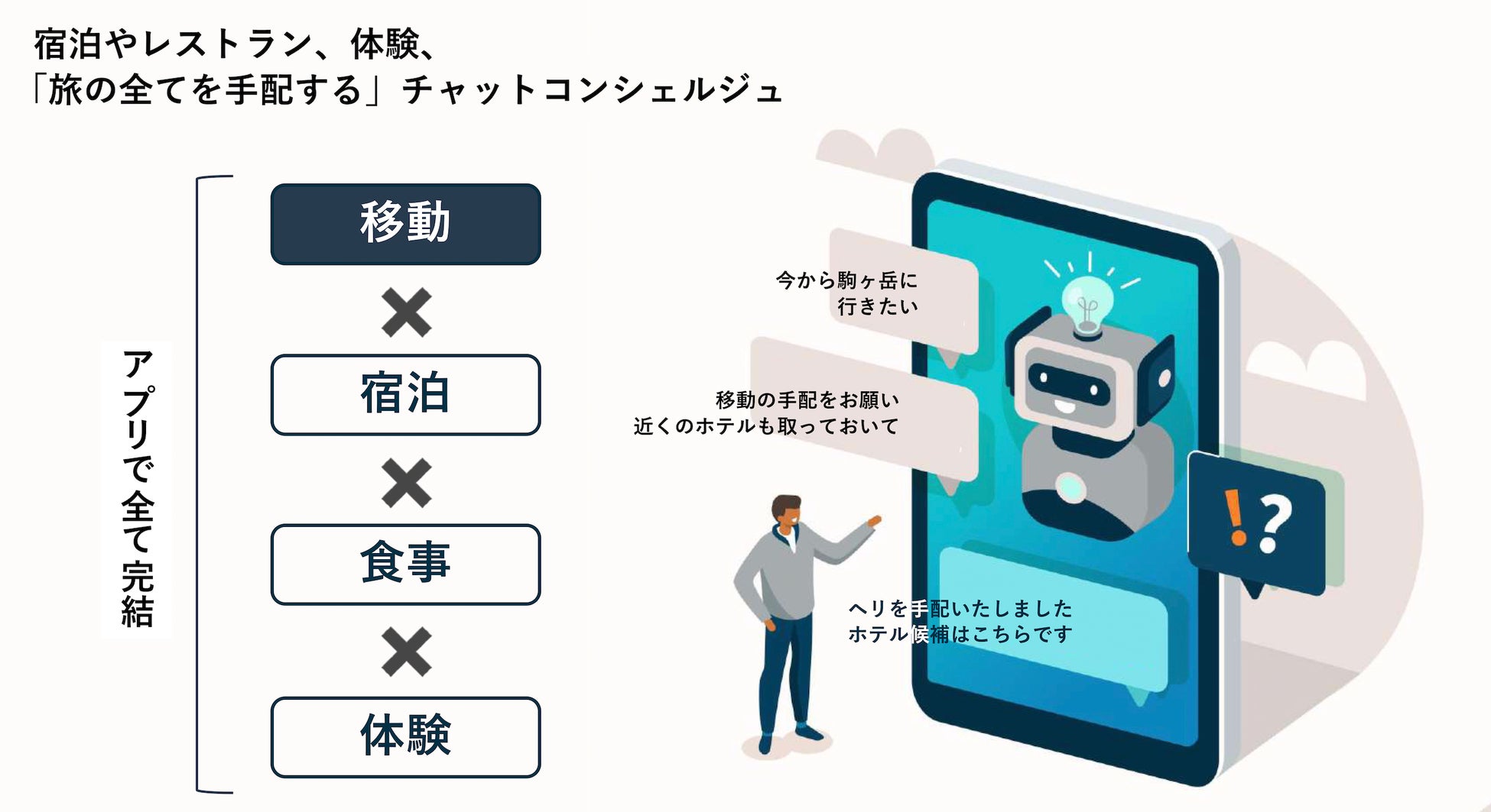 ヘリ以外の移動手段や、宿泊・レストラン・アクティビティに関する予約もAIチャットを用いて一括で管理できる富裕層向けの総合プラットフォームの確立を目指す。今後、よりオンリーワンな体験が求められる中で、旅行パッケージで体験する旅行ではなく、今しか体験できない旅を提供するプラットフォームとして開発を進めていく。