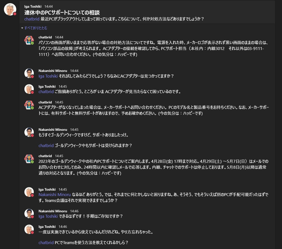 ・Microsoft Teamsとのシームレスな連携:Teamsのチャネルやチャットでの対話を通じて、ハイブリッド対話ボットが自然に参加・応答します。
