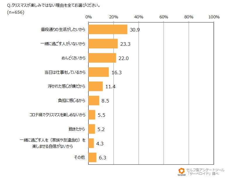 クリスマスを楽しみにしていない理由を聞くと、「普段通りの生活がしたいから」(30.9%)が一番多く、次いで「一緒に過ごす人がいないから」(23.3%)、「めんどくさいから」(22.0%)となりました。