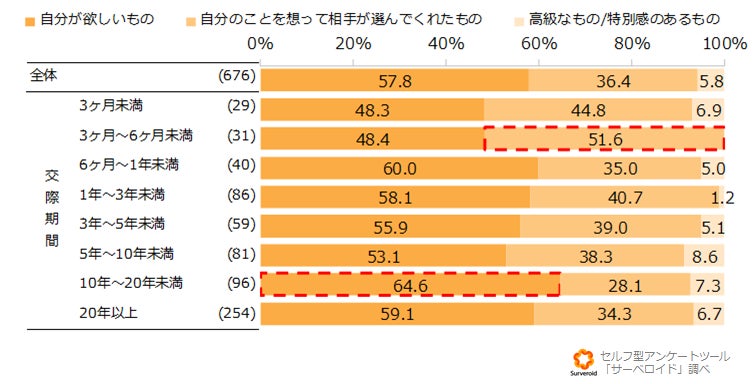 交際期間が長いほどクリスマスというイベントが習慣化し、楽しみに思わない人が多いのではないかと推測していましたが、交際期間が20年以上になるカップル(主に既婚者)以外はクリスマスを楽しみにしていると答えた人が半数以上いる結果となりました。また、交際期間が「3ヶ月~6ヶ月未満」の8割がクリスマスを楽しみにしており、交際期間の中で最も高い結果となりました。