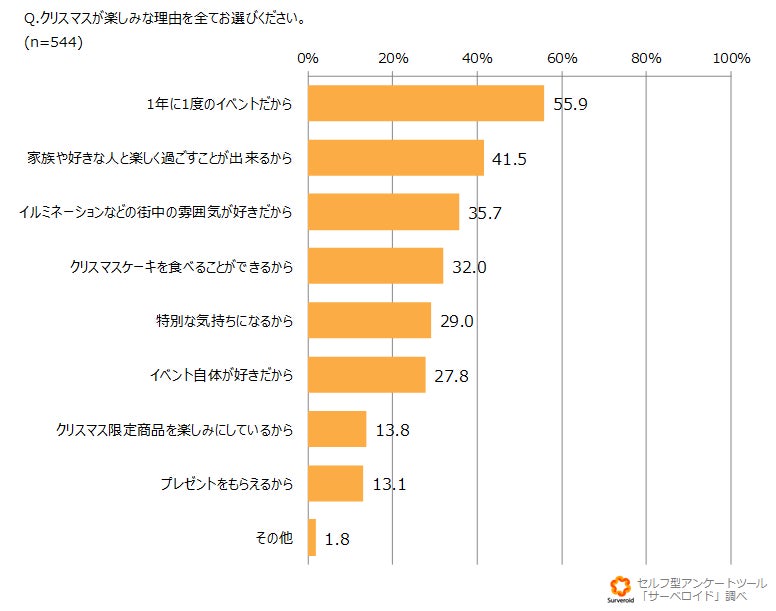 クリスマスを楽しみにしている理由を聞くと、「1年に1度のイベントだから」(55.9%)が一番多く、次いで「家族や好きな人と楽しく過ごすことが出来るから」(41.5%)、「イルミネーションなどの街中の雰囲気が好きだから」(35.7%)となりました。