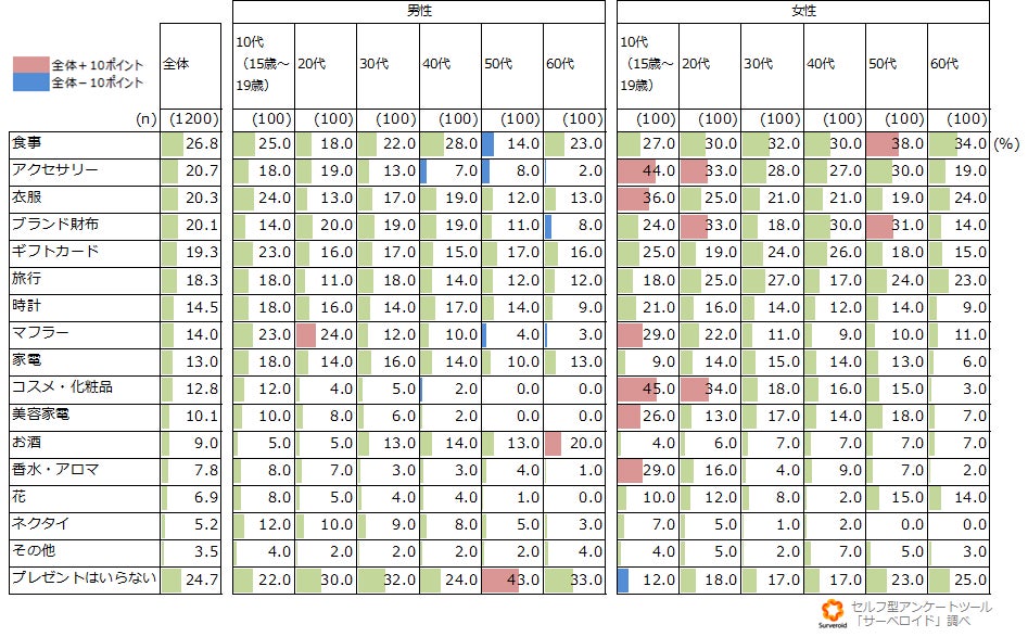性別で比較すると男性の方が「プレゼントはいらない」と思っている割合が多い傾向にあります。また、女性の若年層では「アクセサリー」や「衣服」「マフラー」など身に着けるアイテムが他年代と比べて高い傾向が見られました。