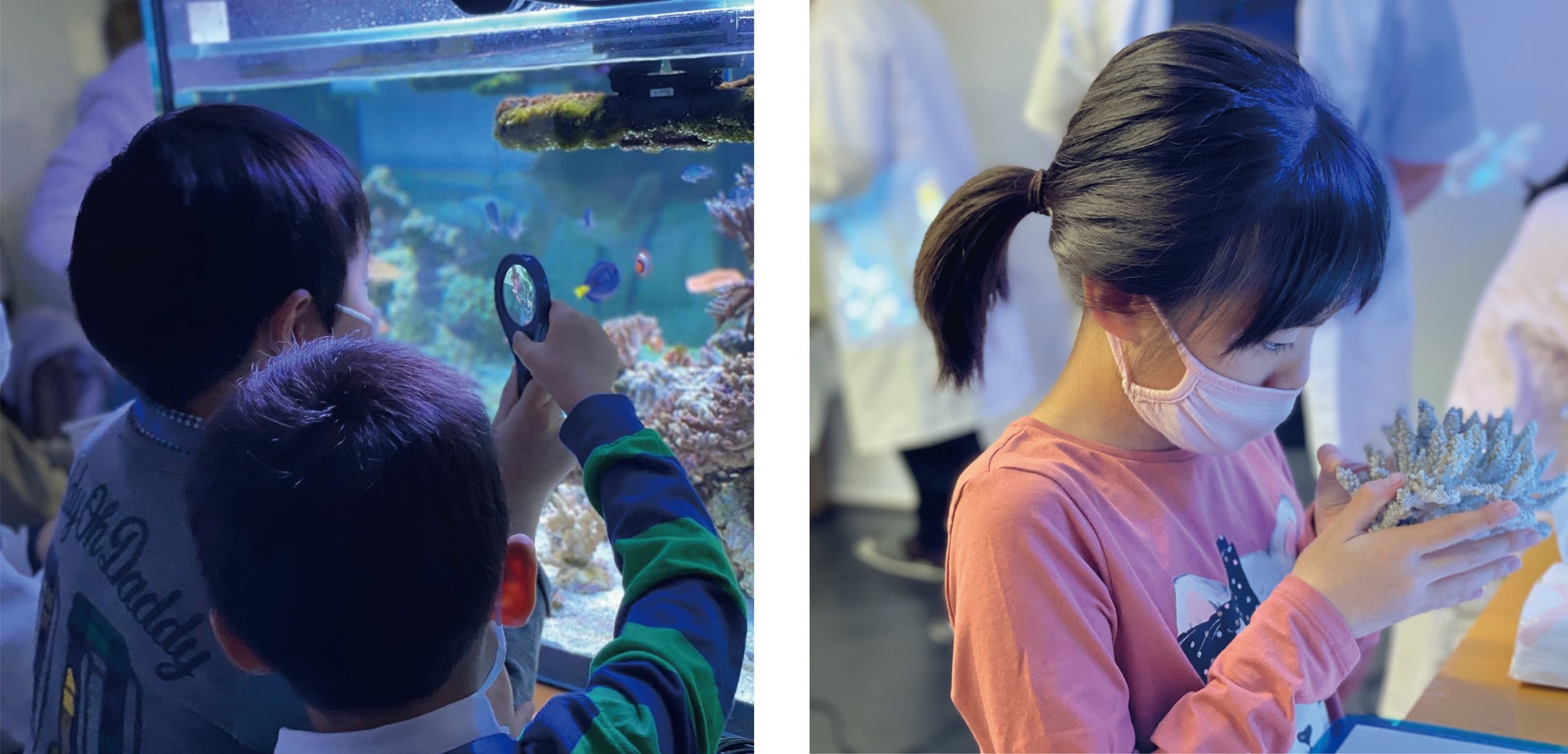 小学生以下の子どもたちを対象に、サンゴ礁の海を再現した水槽を使い、生き物のリアルな生態に触れ、サンゴ礁を取り巻く環境問題を知ることを通して、課題解決力を養う体験型教育プログラム「サンゴ礁ラボ」。今回、気軽に学べるよう通常のプログラムをユニモ用にカスタマイズ。生きているサンゴ、死んでしまったサンゴに実際に触れて観察したり、サンゴクイズを通して海の環境を学び、生き物の不思議さや面白さを体感いただきます。