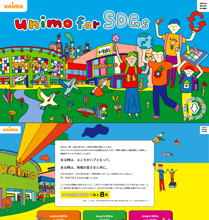 SDGs専用サイト「unimo for SDGs」では、日々の活動のご報告の場として、また一緒に活動できるパートナーへの発信の場として、さらにはより身近にそして自分事として考えていただくきっかけとなるように、2022年4月に立ち上げました。地域住民・企業・団体向けの情報コンテンツと、親子で学べるミニ学習コンテンツで構成し、立場の異なる様々な方が見ても、それぞれにとってためになるように考え作成いたしました。