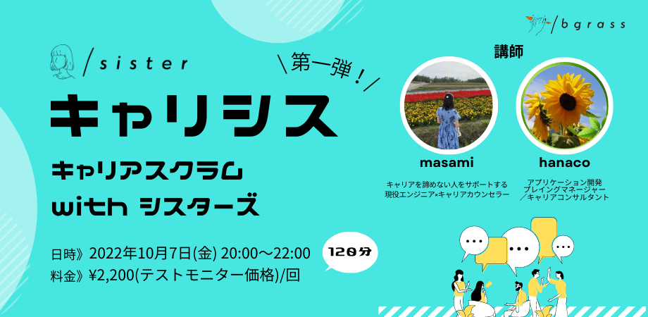 bgrass株式会社(本社:東京都渋谷区、代表:咸 多栄)は、テック業界で働く女性向けのキャリアイベント「キャリアスクラム with シスターズ」β版をオンライン開催いたします。