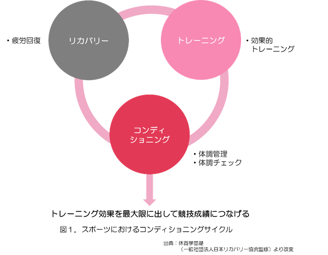 アスリートは身体的・精神的にストレスが多い環境下にあり、過剰なストレス下ではコンディションの低下をきたします。そのため、トレーニング、リカバリー、コンディショニングのサイクルを効果的に回すことがパフォーマンスアップにつながるといわれています(図1)。