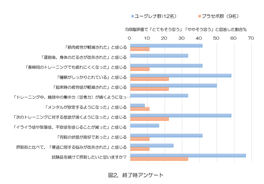・体感アンケートではユーグレナ群の40%以上の方が、「筋肉疲労軽減」「長時間トレーニングでも疲れにくくなったと感じる」「起床時の疲労感軽減」「次のトレーニングへの意欲を感じる」「胃腸の調子が良くなった」の項目で、「そう思う」との回答をし、プラセボ群に比べて、高い値を示しました。特に「睡眠がしっかりとれている」「継続摂取意向」ではユーグレナ群の60%以上の方が「そう思う」と回答をし、有意な結果が得られました(図2)。