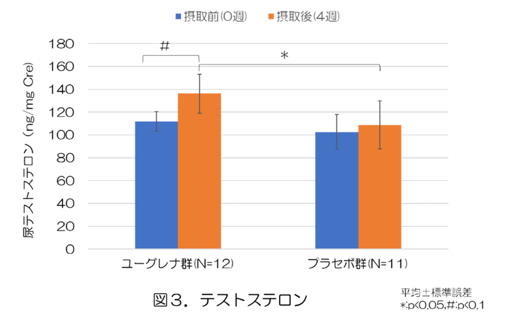 ・尿テストステロン*6において摂取後実測値でユーグレナ群の方が有意に高く、さらに摂取前後で高い傾向を示しました(図3)。