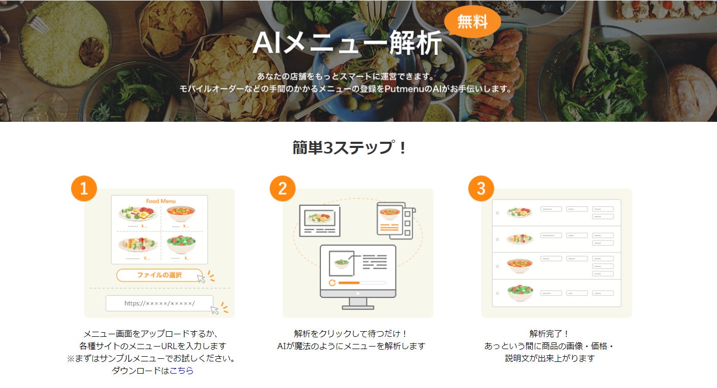 この度、「Putmenu」では、最新AIが飲食店のメニュー画像を解析して、モバイルオーダーなどの手間のかかる準備を無料でお手伝いする「Putmenu AI」を開発しました。「Putmenu AI」はWebサイトで利用いただけます。