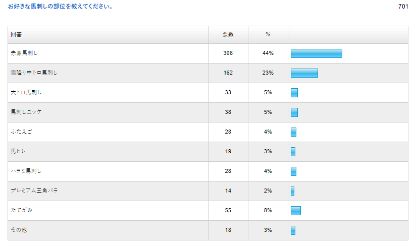 お好きな部位は何位でしたか?今後も馬刺しの良さを全国に広めるため、馬刺しに関するアンケートや旬の馬刺し情報などを発信できればと考えています。