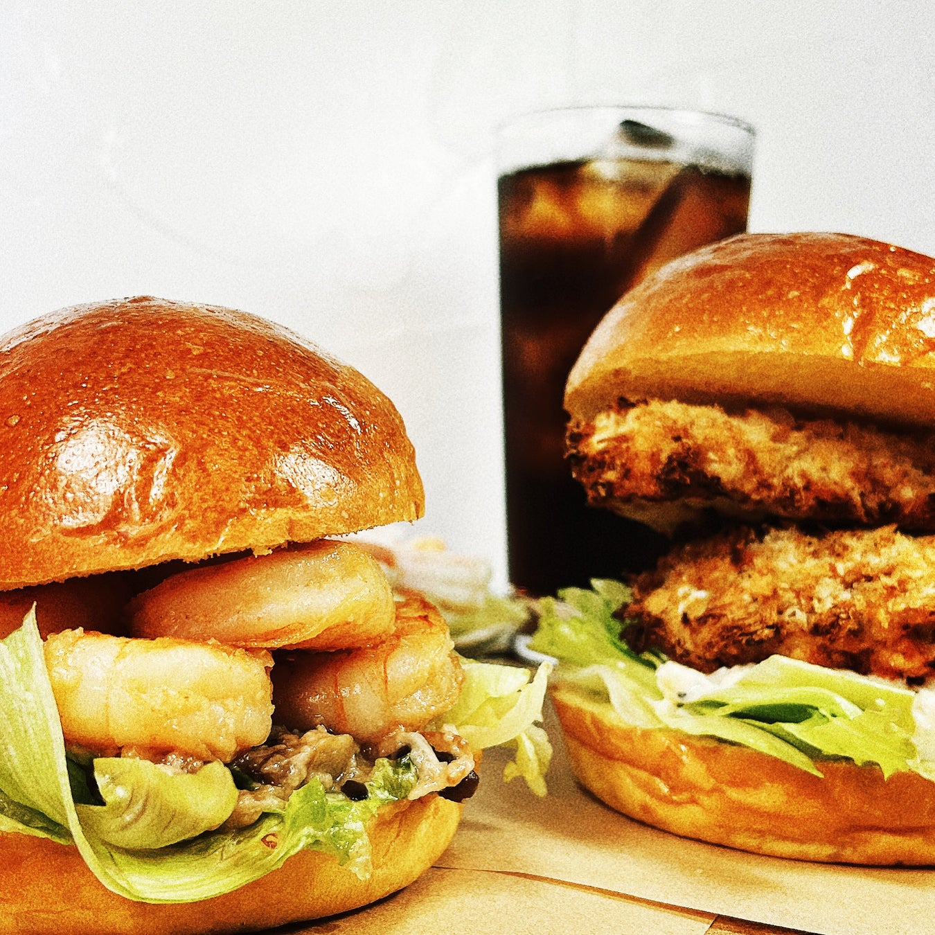 また、ボイルしたエビを使った「えびバーガー」や大粒むきエビを使った「ガーリックシュリンプバーガー」もたっぷり2段重ねした「大盛りバーガー」を用意しています。