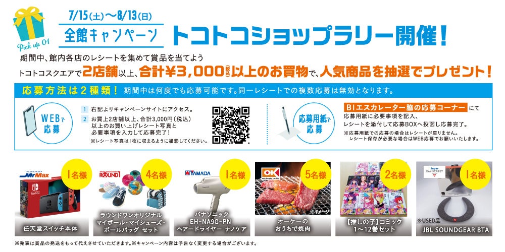 期間中、トコトコスクエアで2店舗以上、合計¥3,000円(税込)以上のお買物で、トコトコスクエアの人気商品を抽選でプレゼントするキャンペーンです。WEBまたは応募用紙にてご応募いただけます。